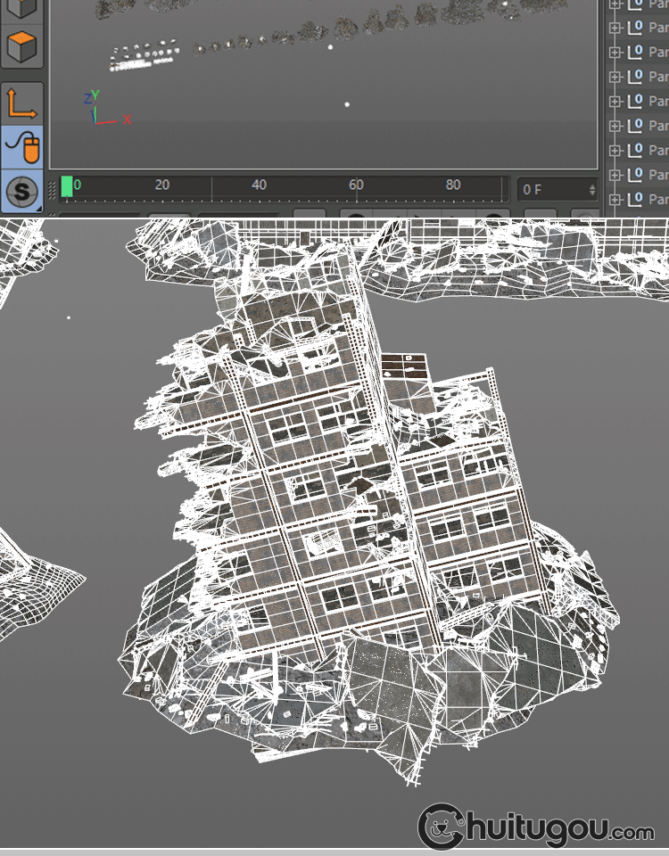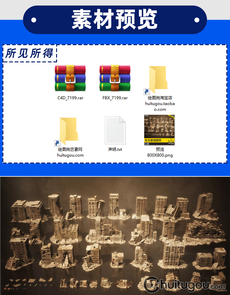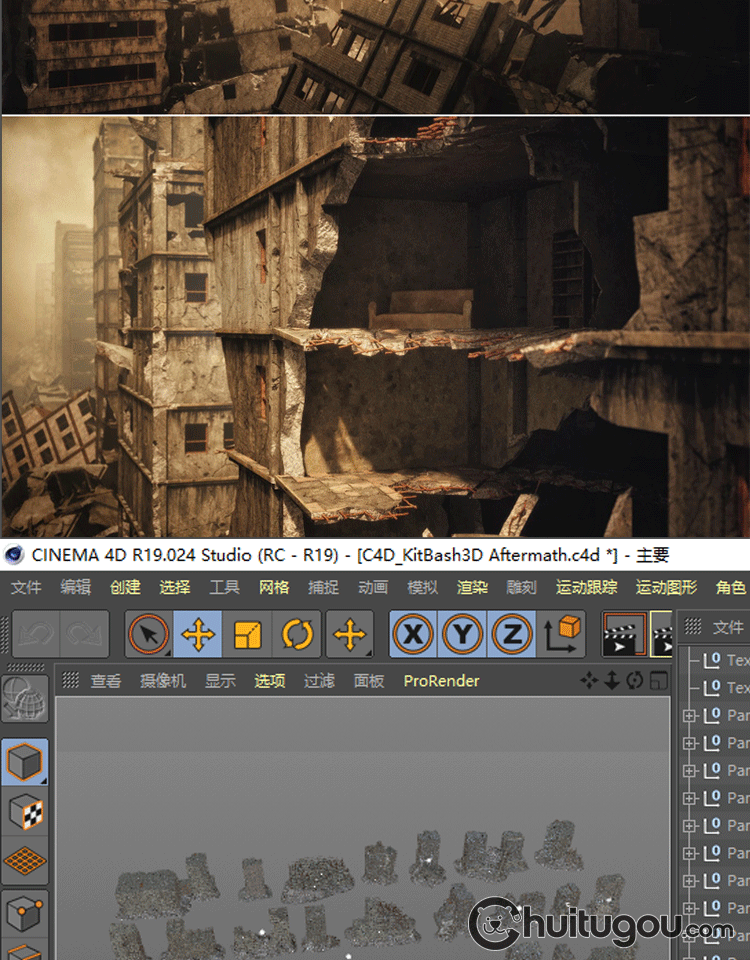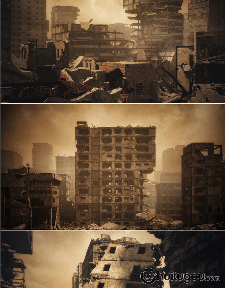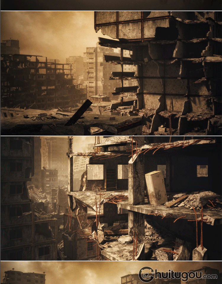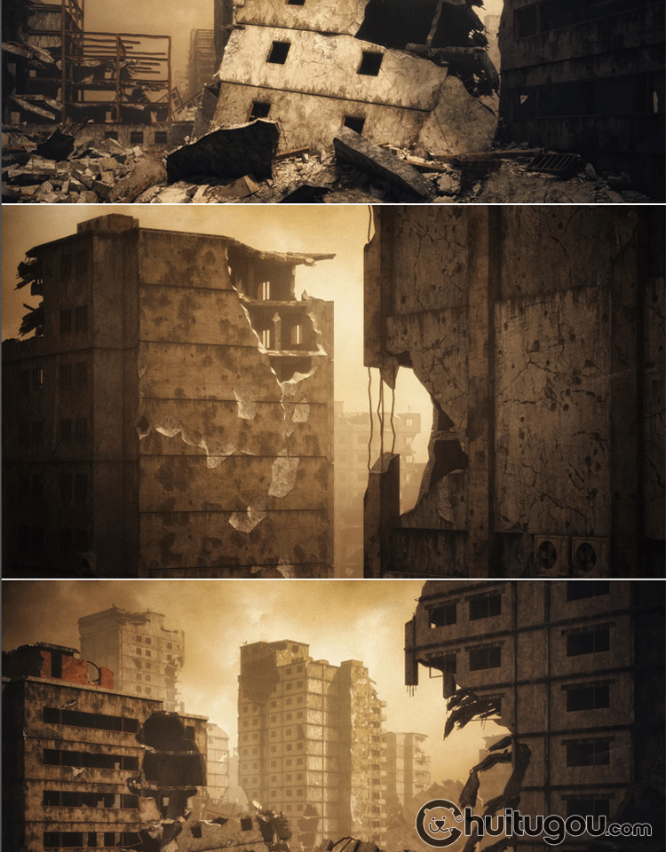 C4D末日废墟建筑模型FBX战损倒塌楼房损毁房屋3D建模渲染素材文件