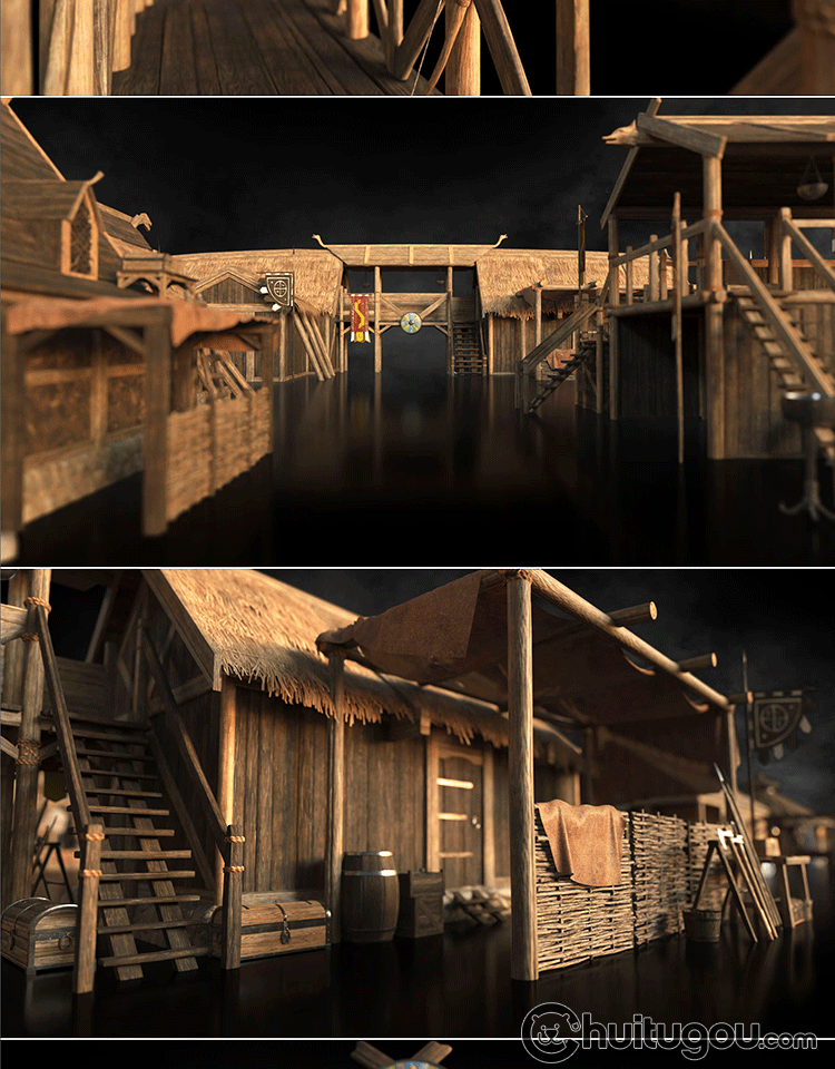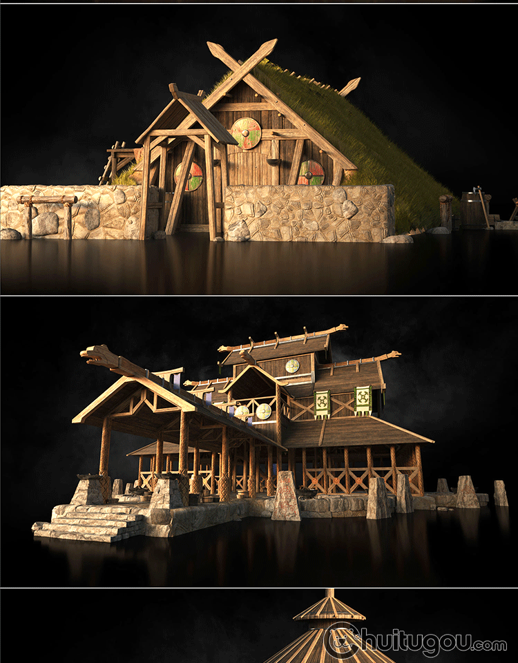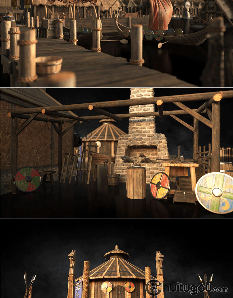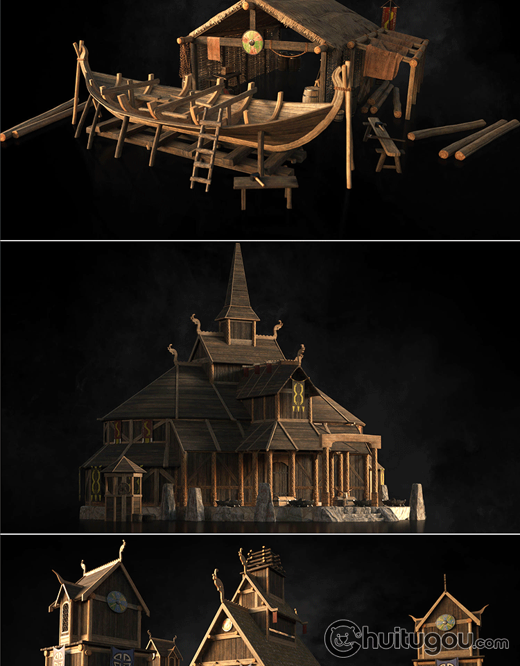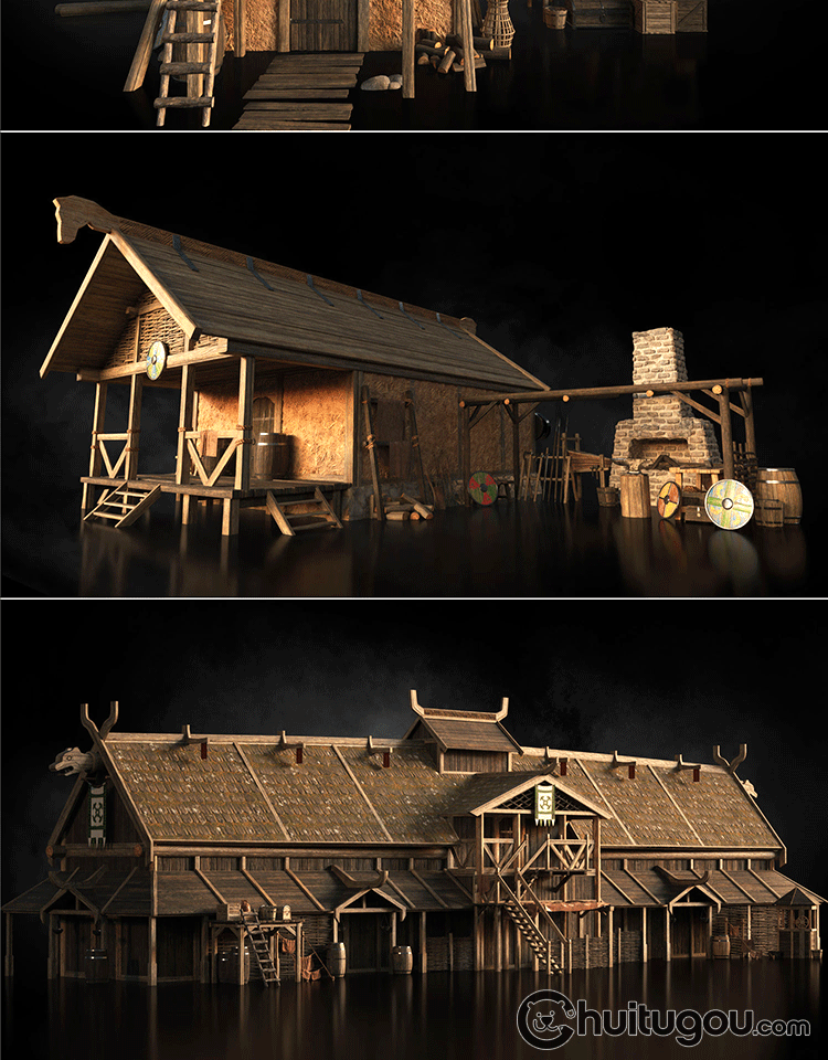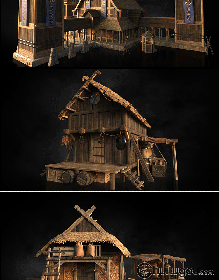 C4D中世纪维京建筑PBR海盗木屋茅房FBX木器道具MAYA建模渲染素材
