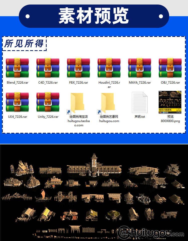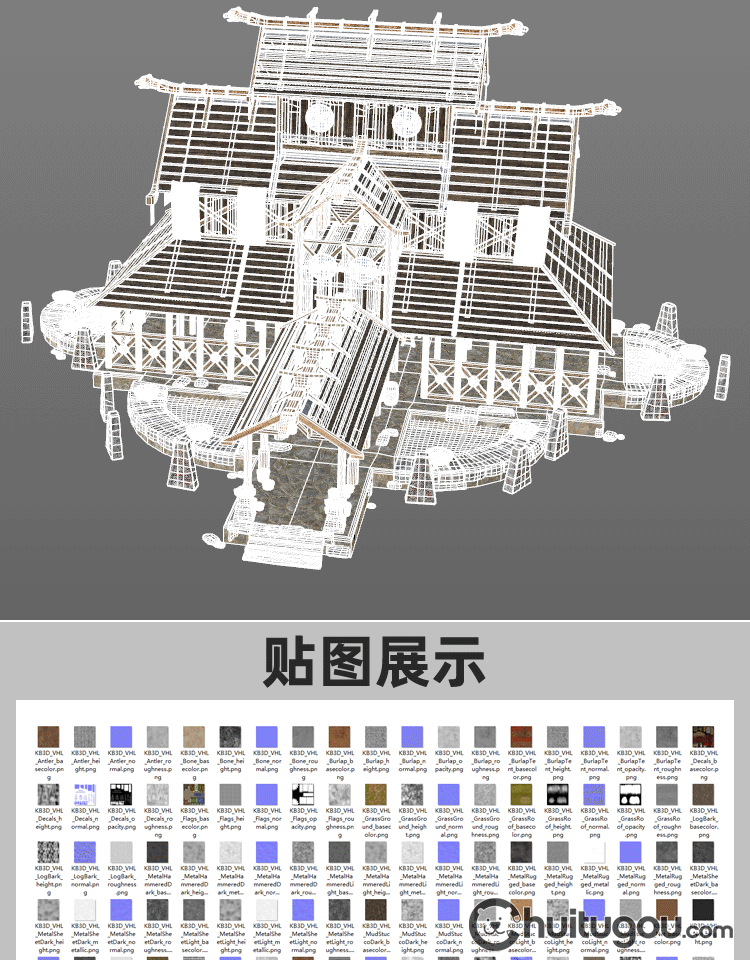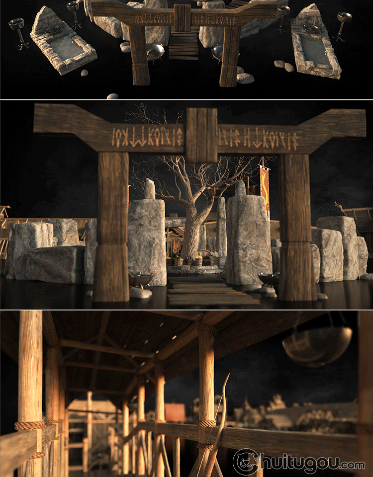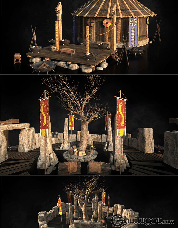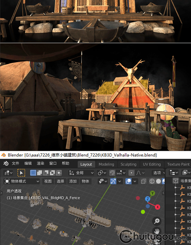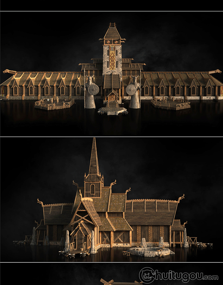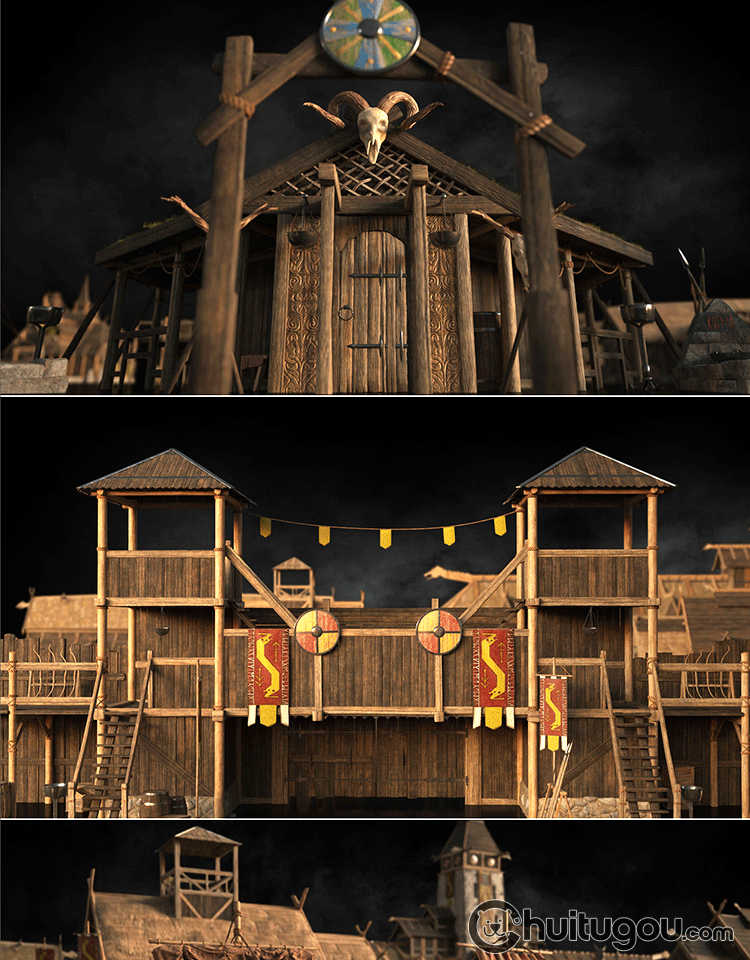 C4D中世纪维京建筑PBR海盗木屋茅房FBX木器道具MAYA建模渲染素材