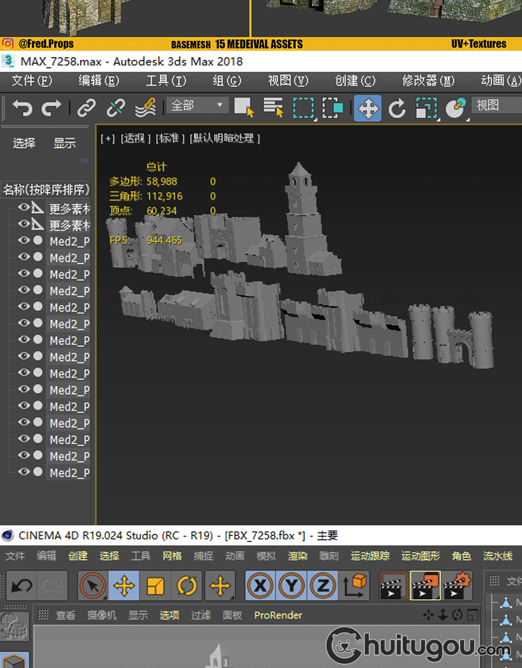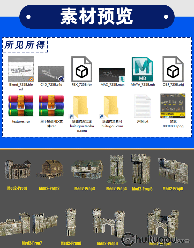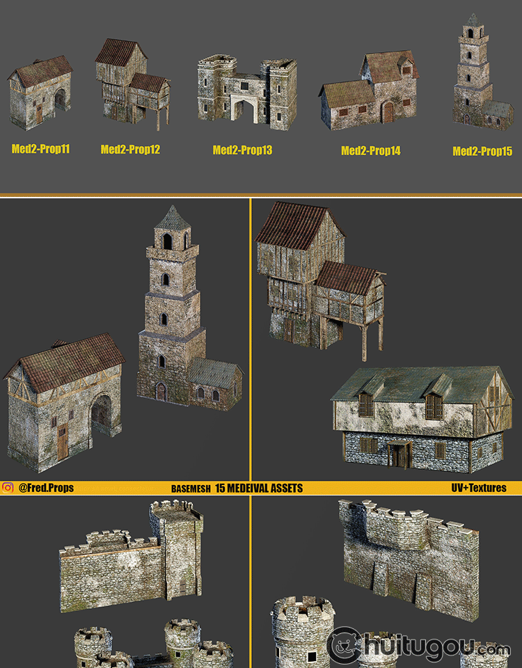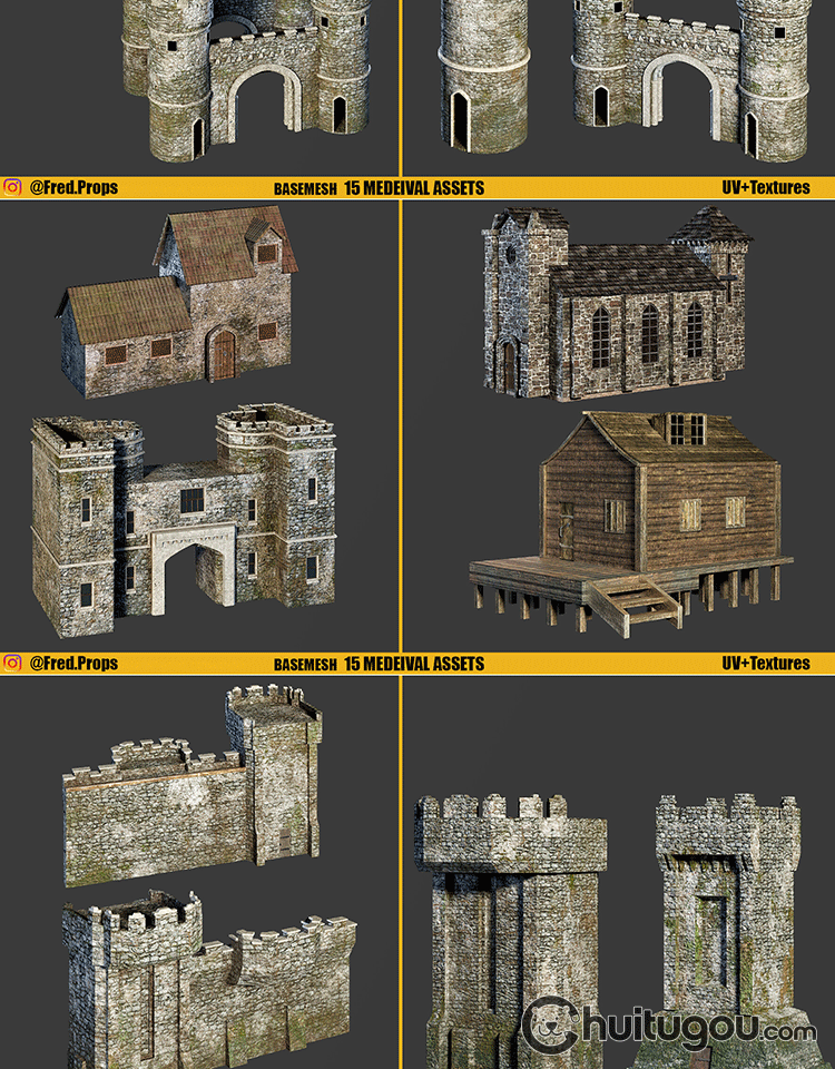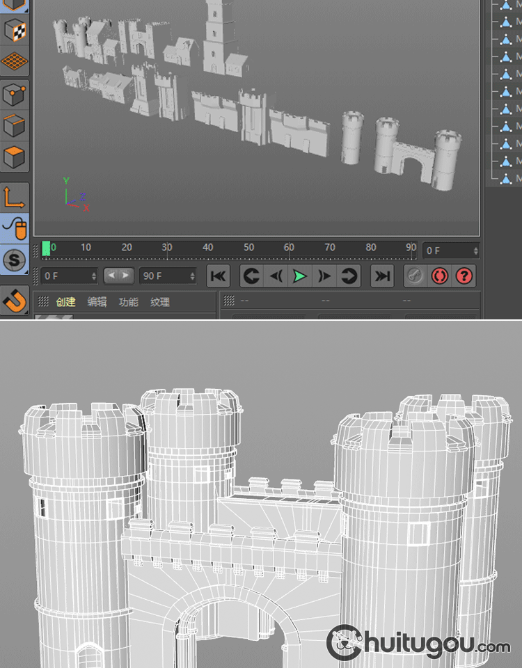 MAYA中世纪城墙碉楼房屋建筑3D模型C4D格式OBJ白模 建模渲染素材