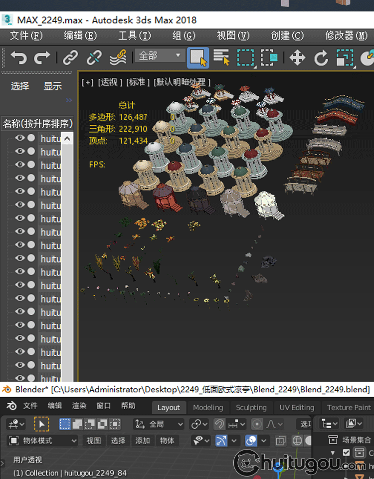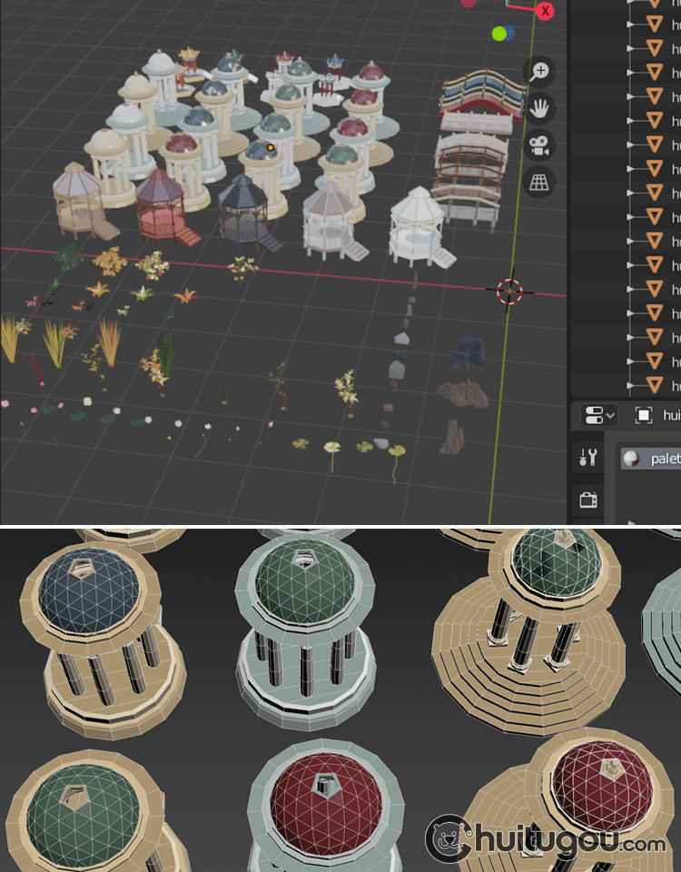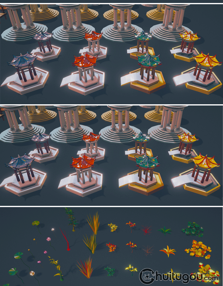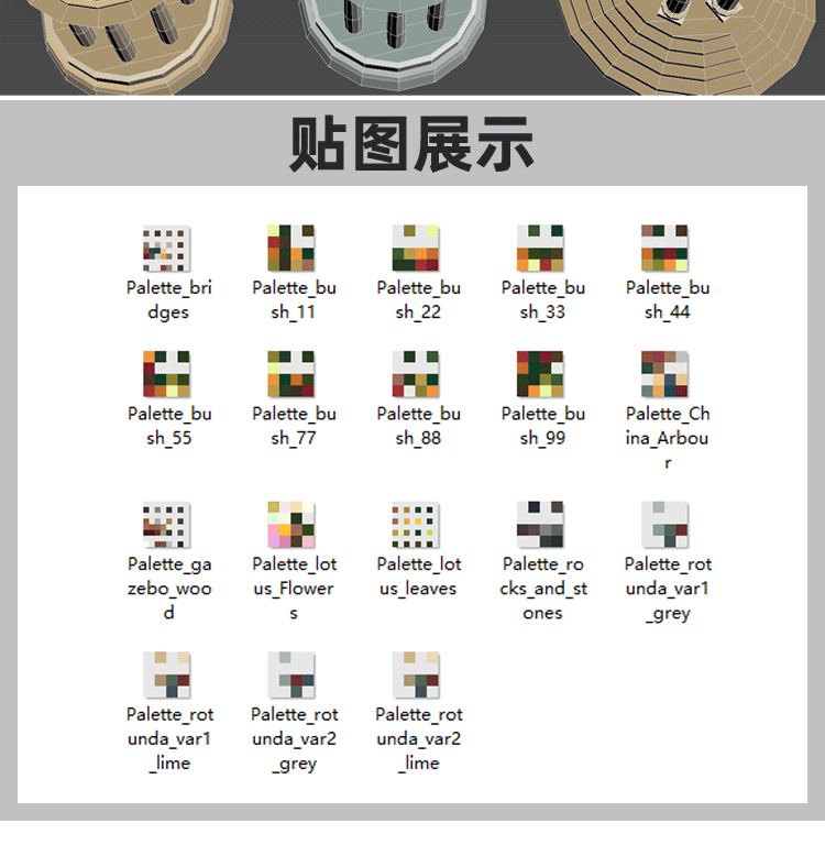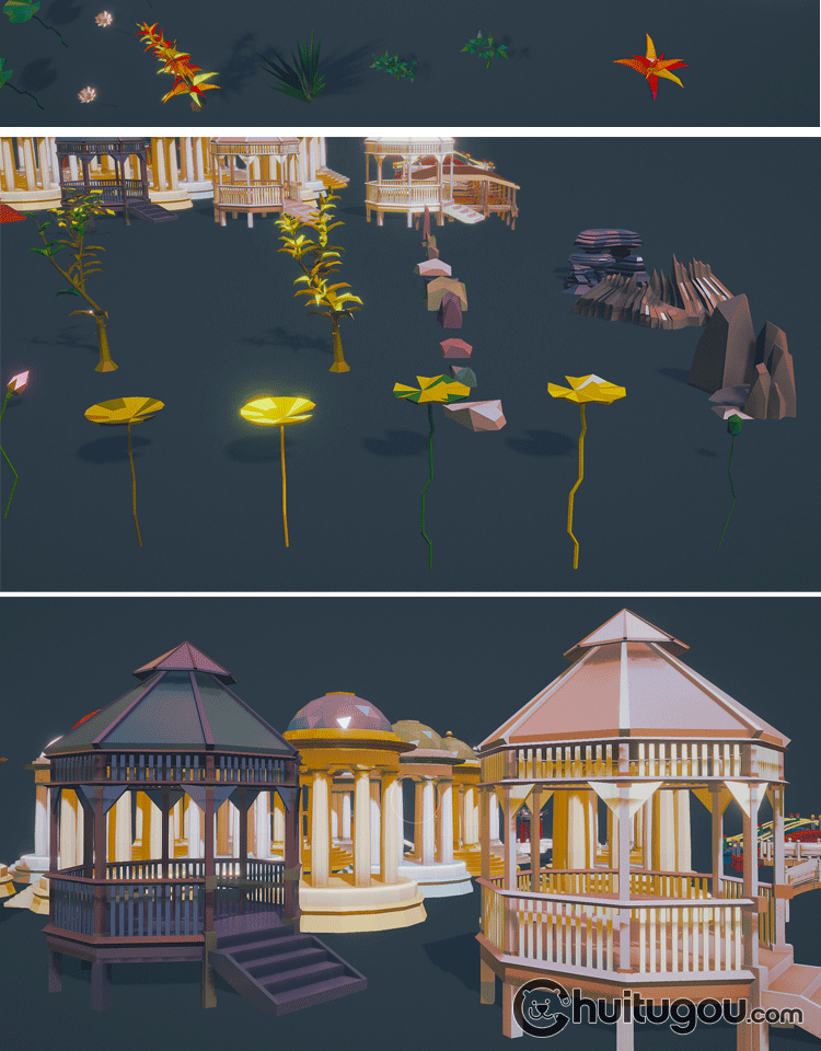 低面后花园资产Blend凉亭模型C4D木桥MAX卡通荷花睡莲岩石OBJ素材