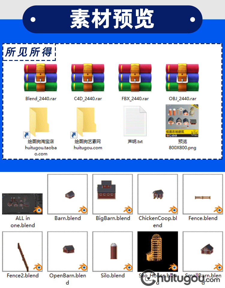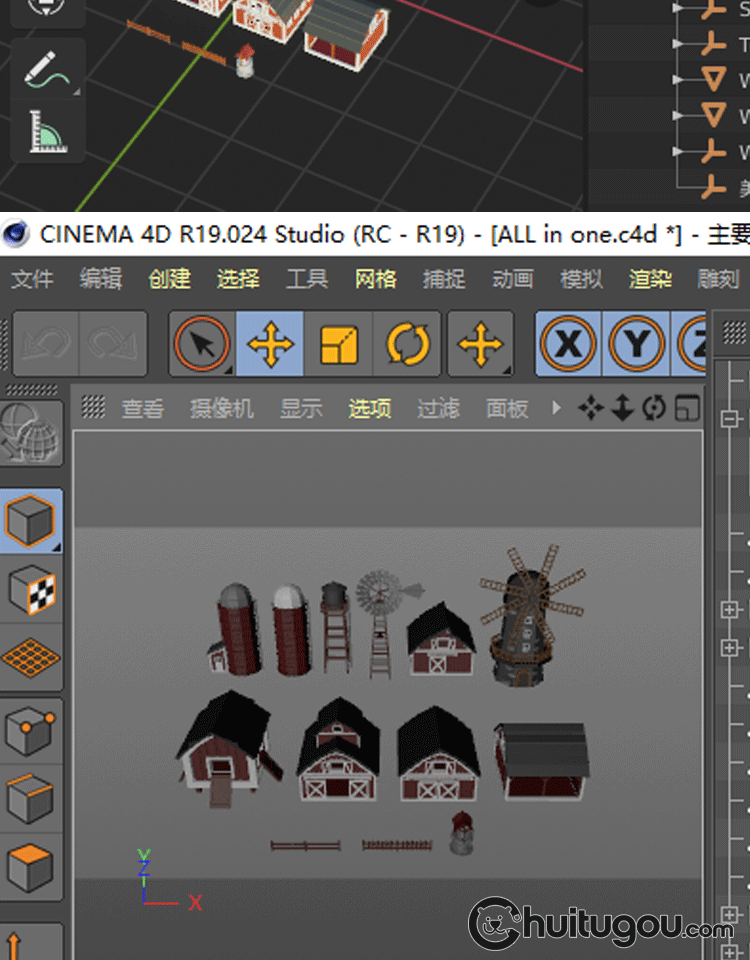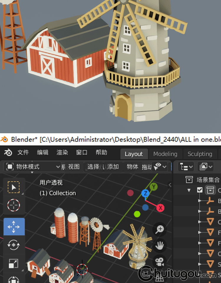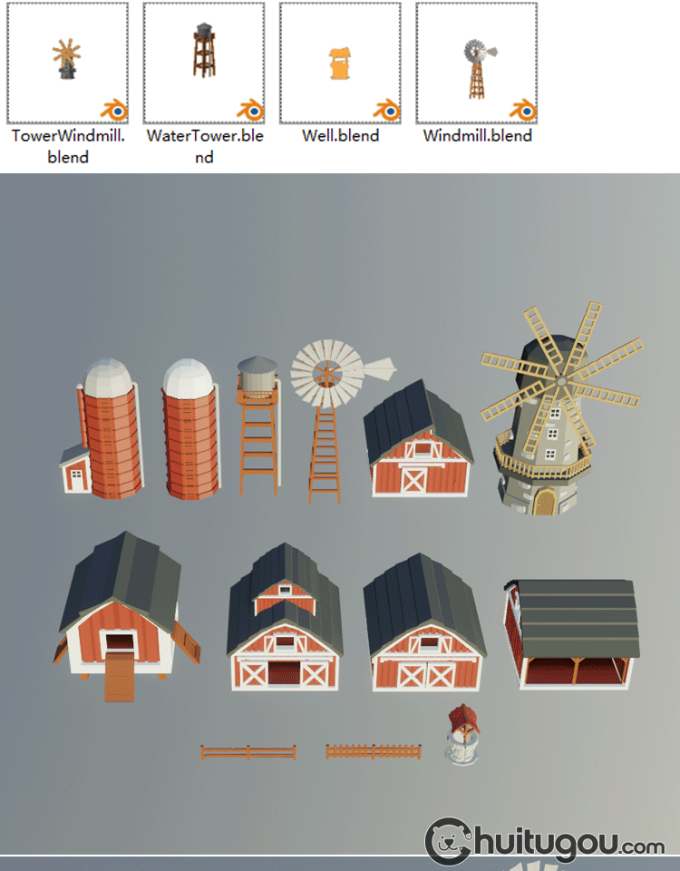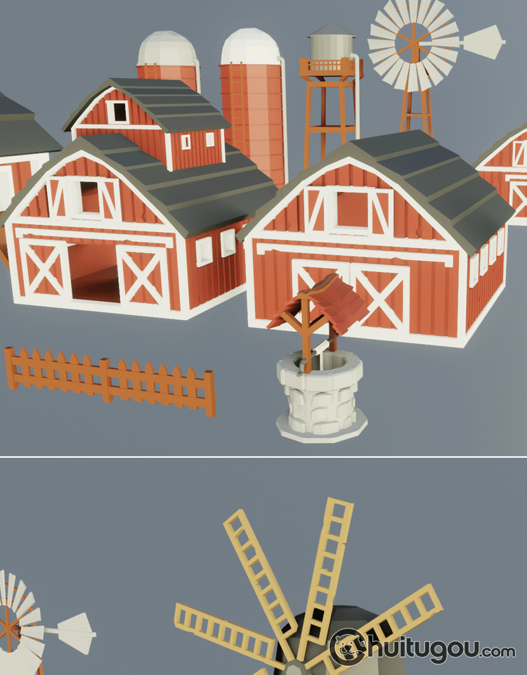C4D卡通农场木屋建筑3D模型Blend房子风车仓库鸡舍井口MAX素材FBX