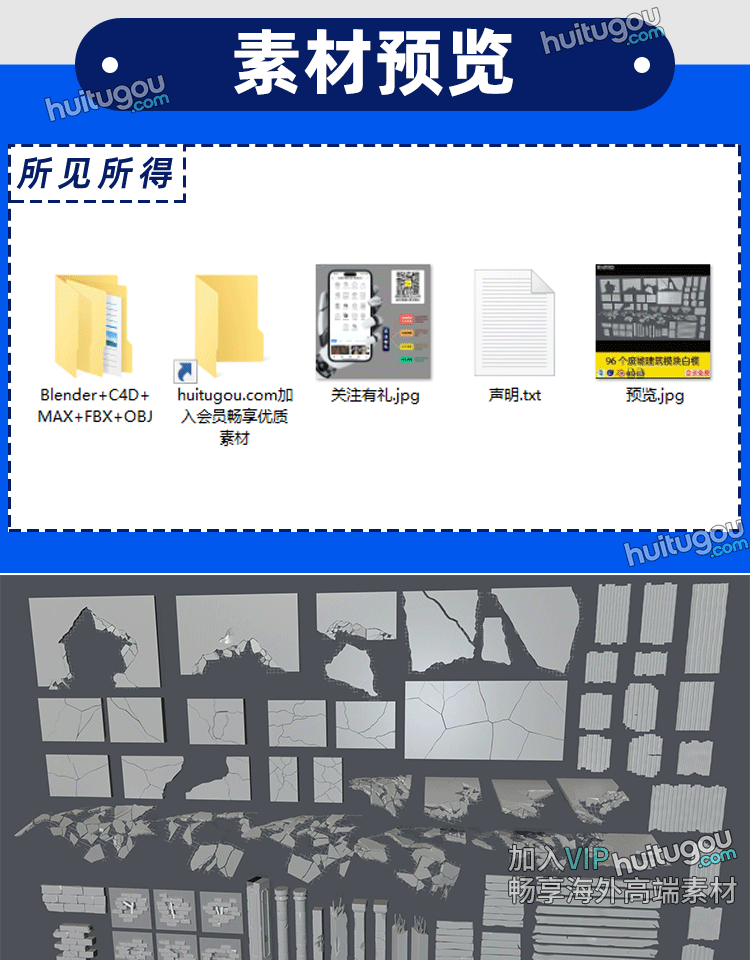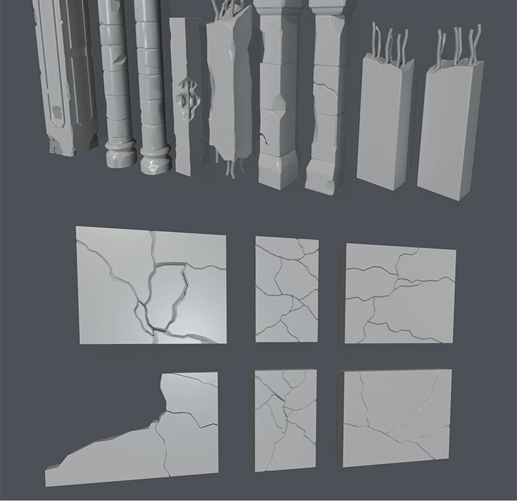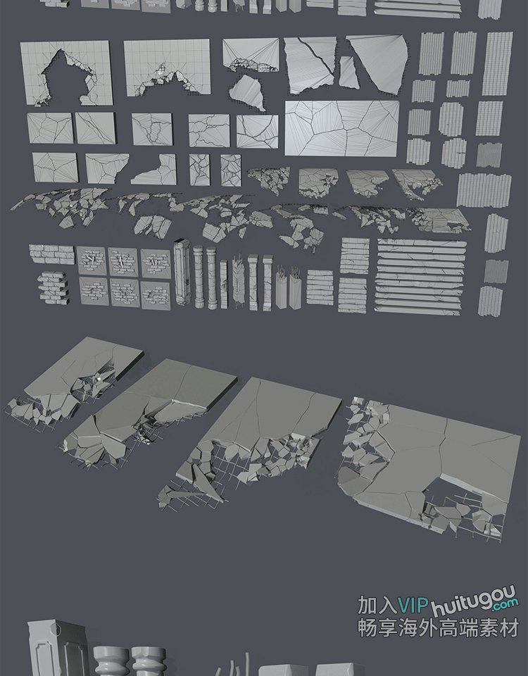 96个废墟残垣断壁破碎楼板墙体建筑模块白模3D建模渲染设计素材