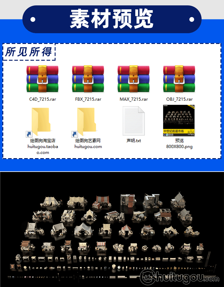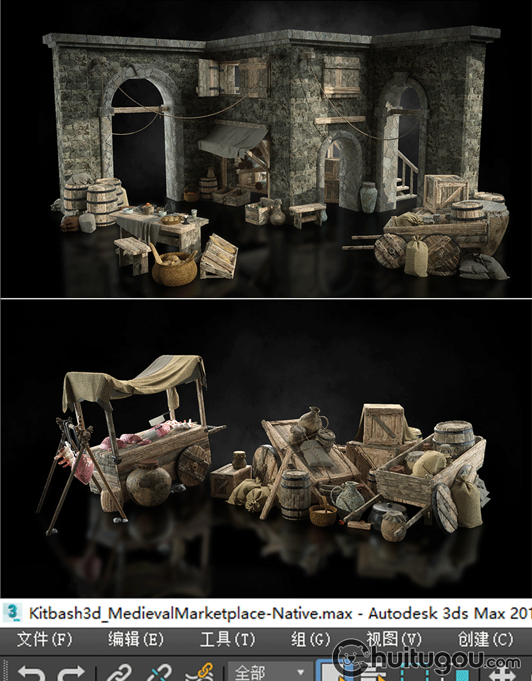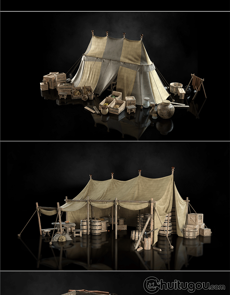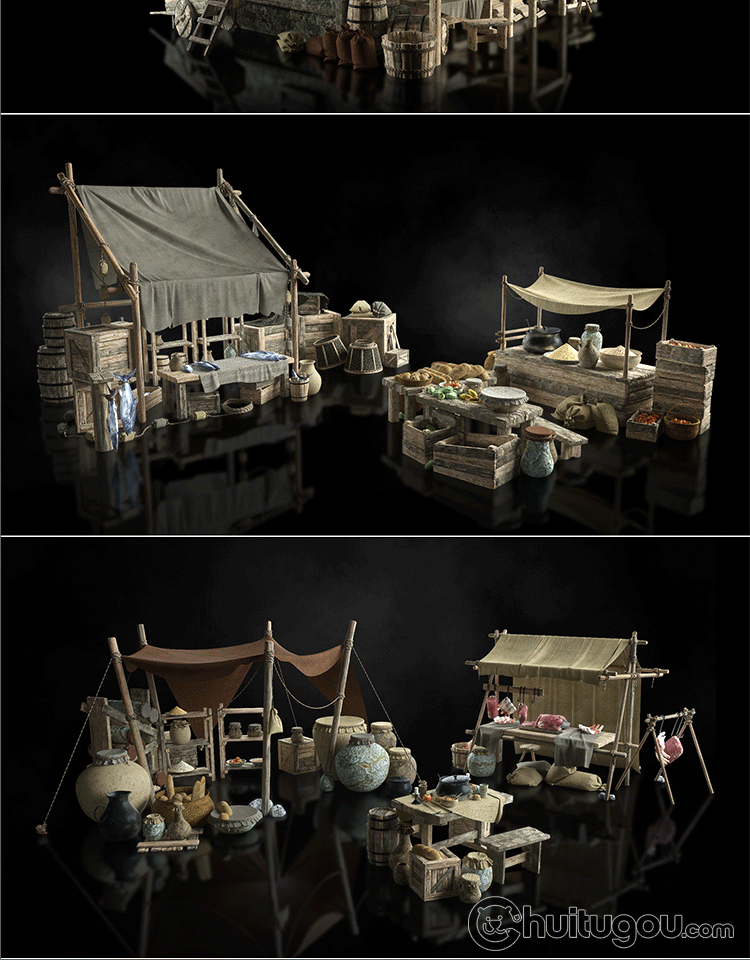 中世纪摊位模型C4D古代市场集市MAYA兵器盔甲布匹陶瓷鱼肉档口FBX