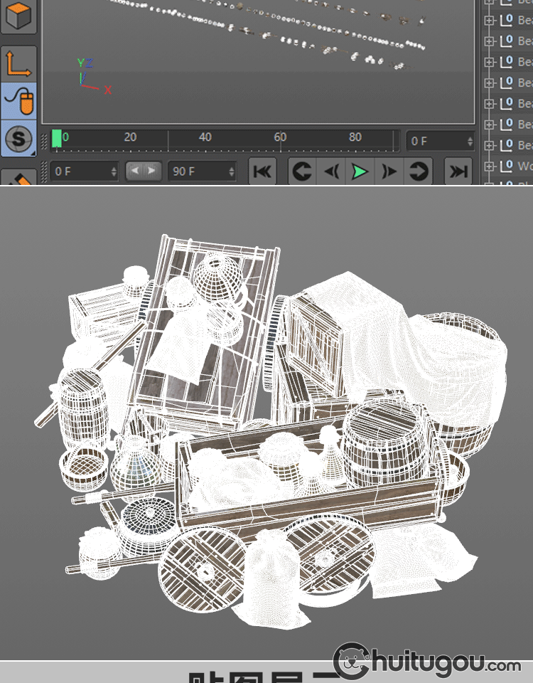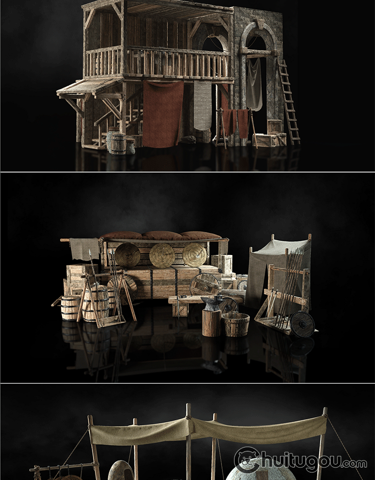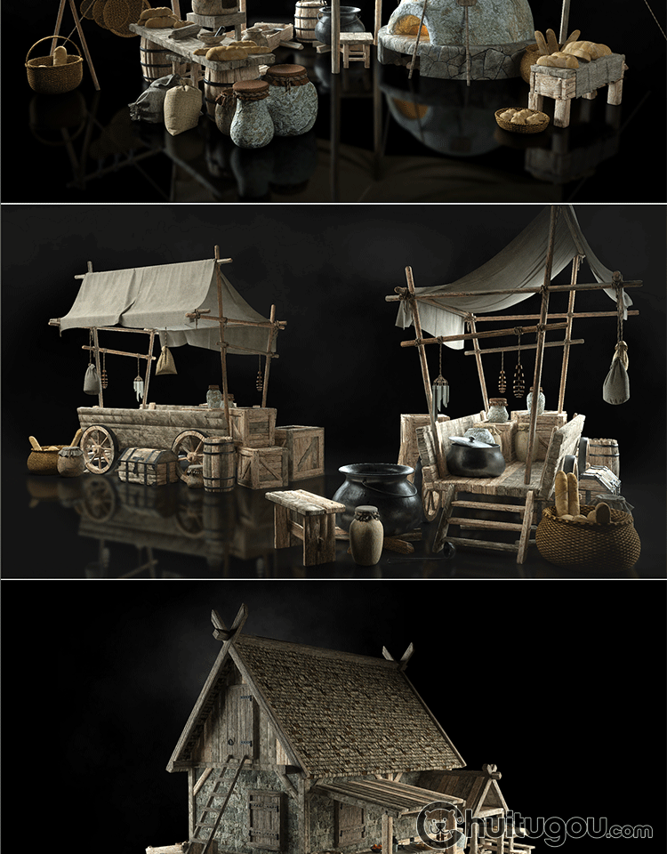 MAX中世纪老旧木屋棚子摊位模型C4D古代市场建筑木桌瓷器麻袋推车