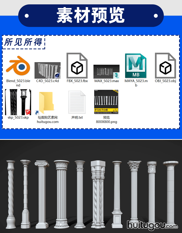 10个 雕花罗马柱子Blend建筑装饰柱模型C4D mb MAX SU OBJ 3D素材
