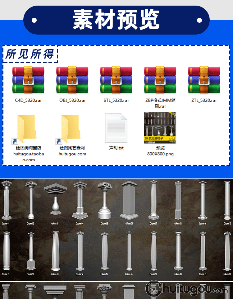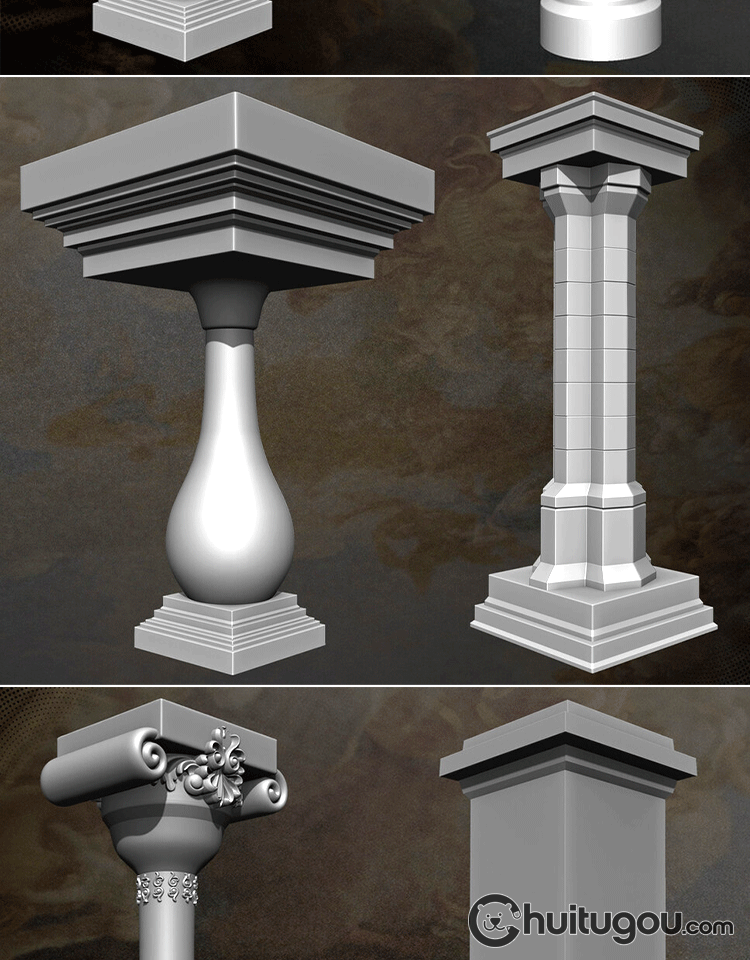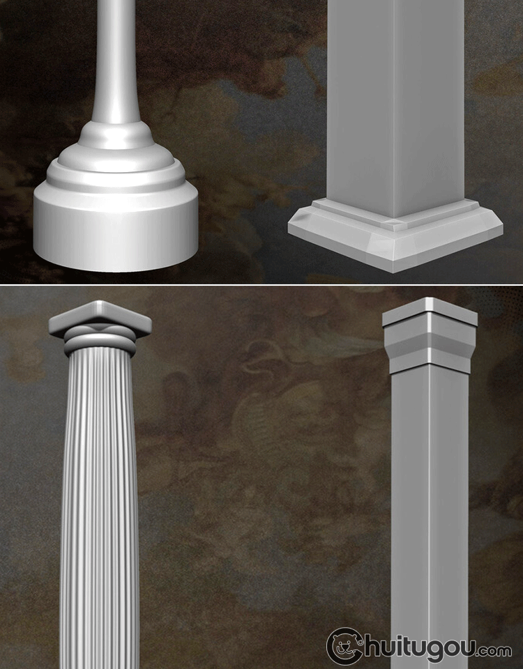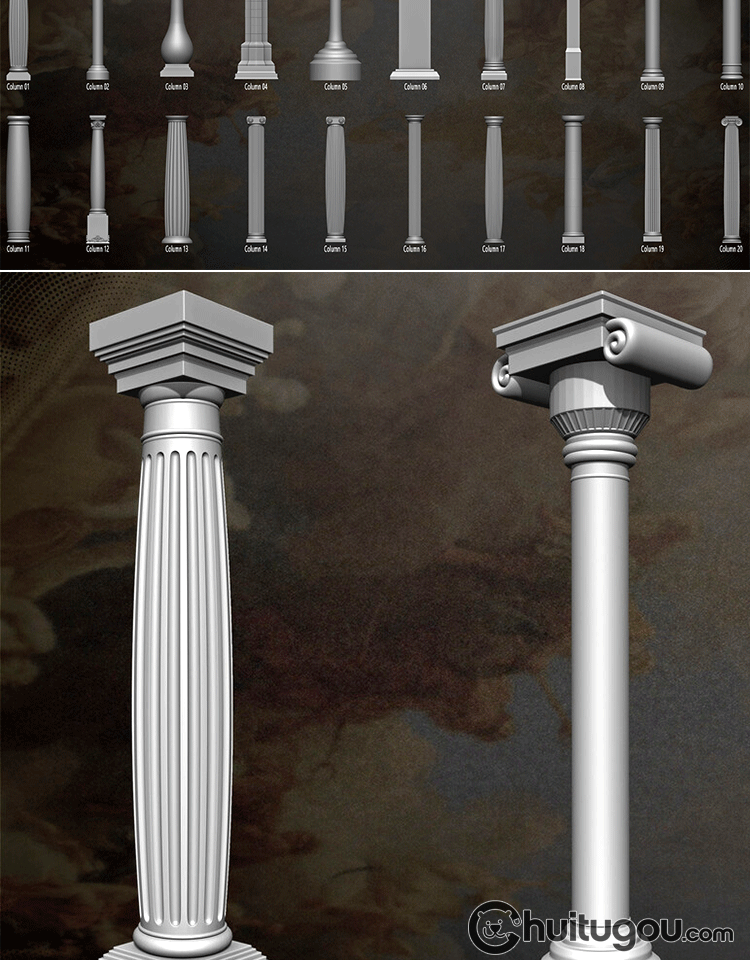 欧式建筑装饰柱子3D模型附ZBP格式IMM笔刷C4D建模素材OBJ犀牛STL