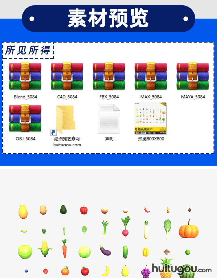 卡通蔬果包Blend水果蓝莓苹果菠萝C4D蔬菜辣椒萝卜mb FBX OBJ素材