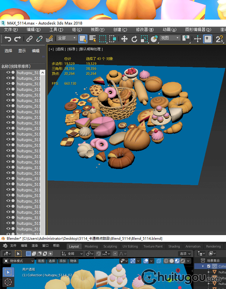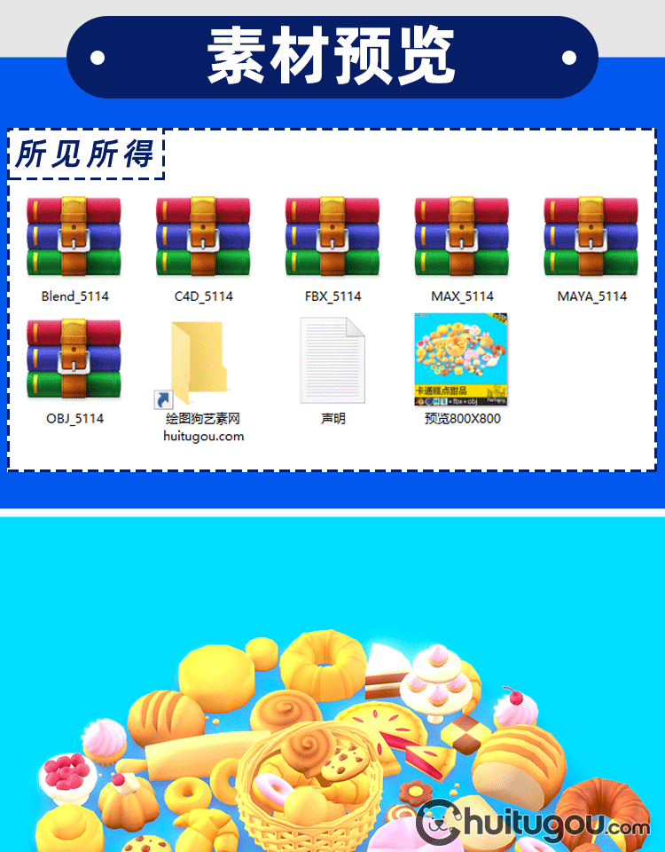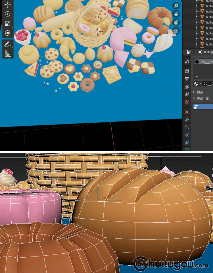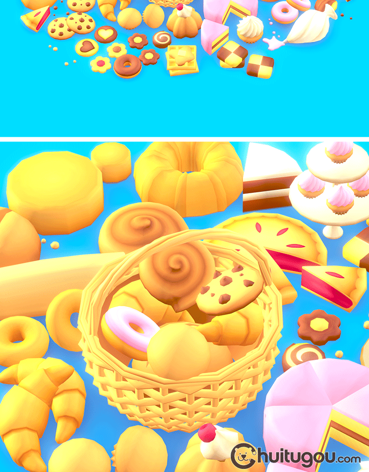 卡通糕点面包C4D奶油小蛋糕Blender食品竹篮子MAX蛋挞FBX OBJ格式