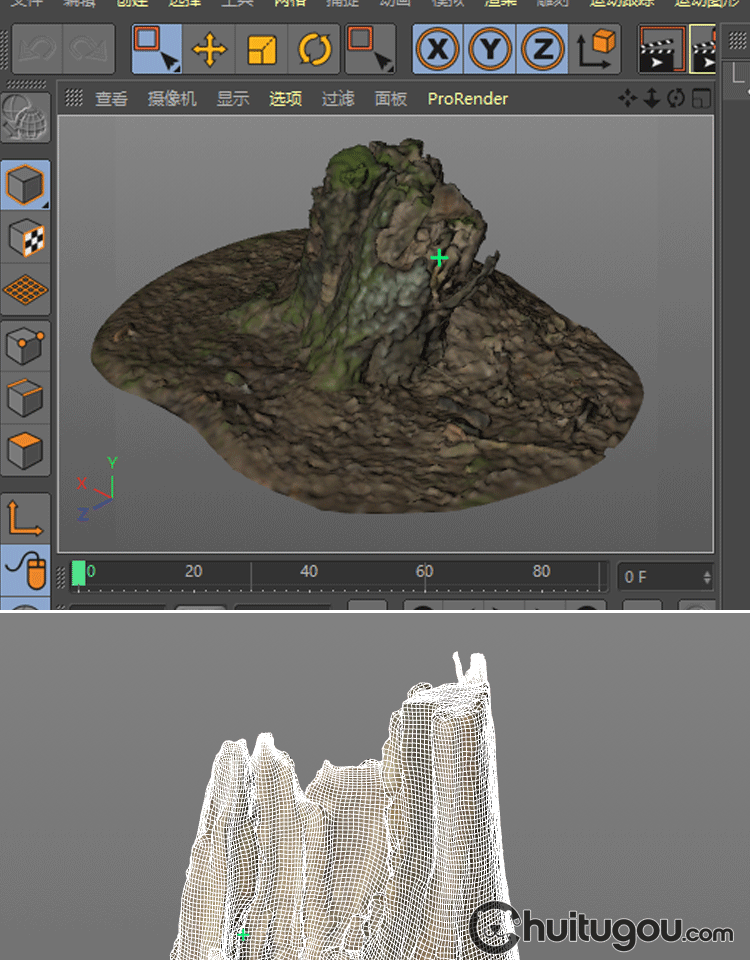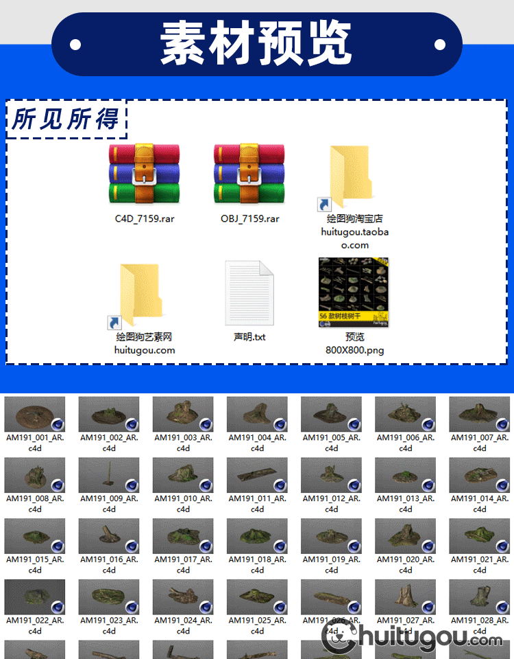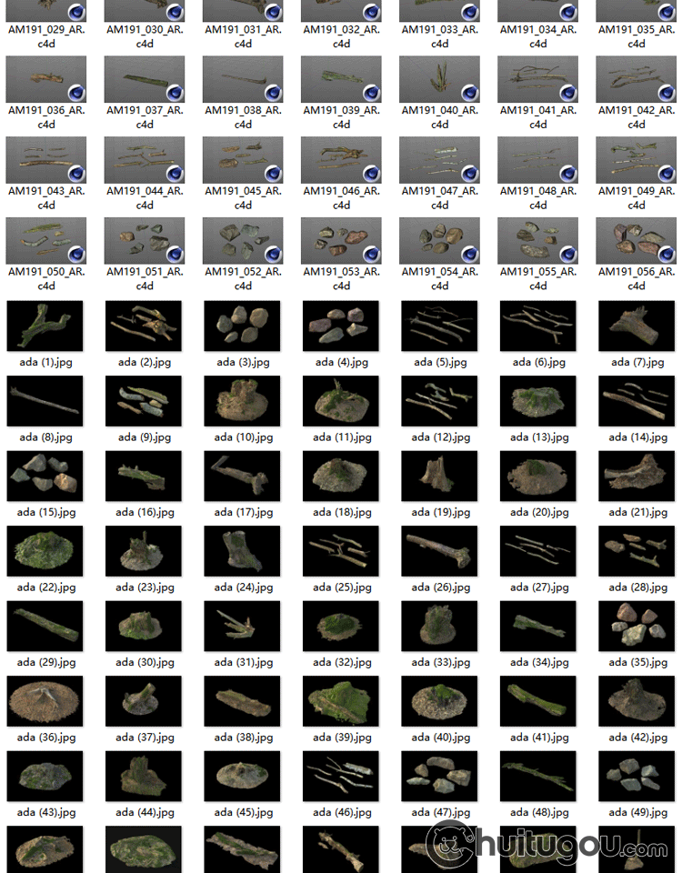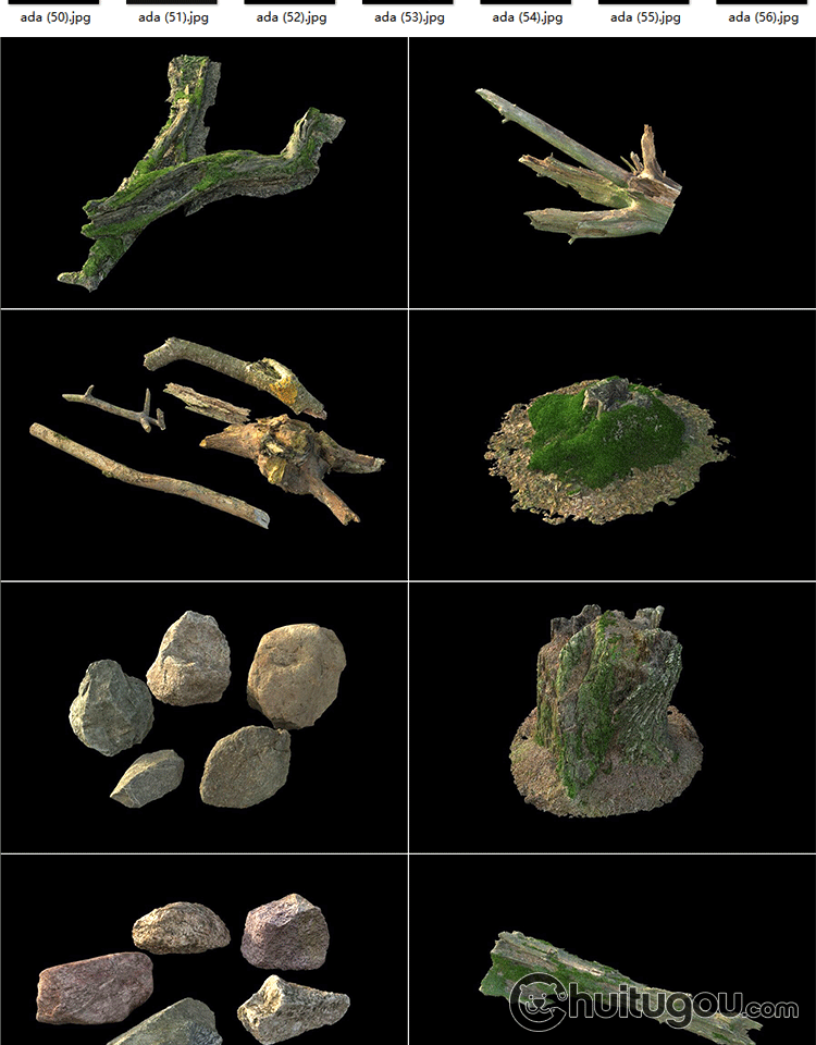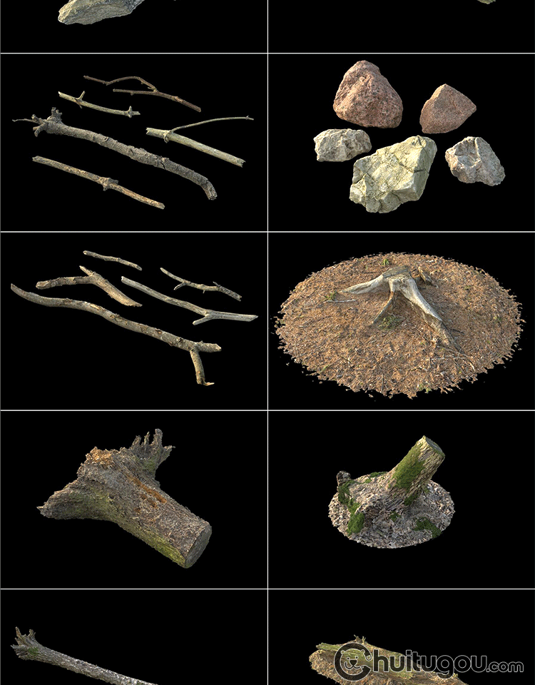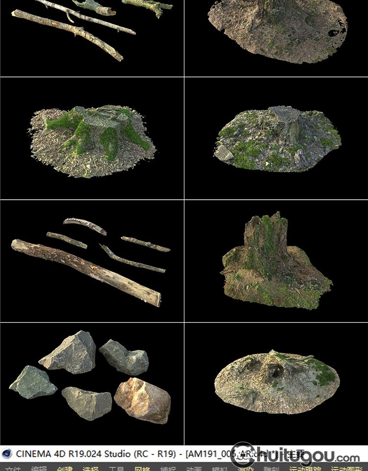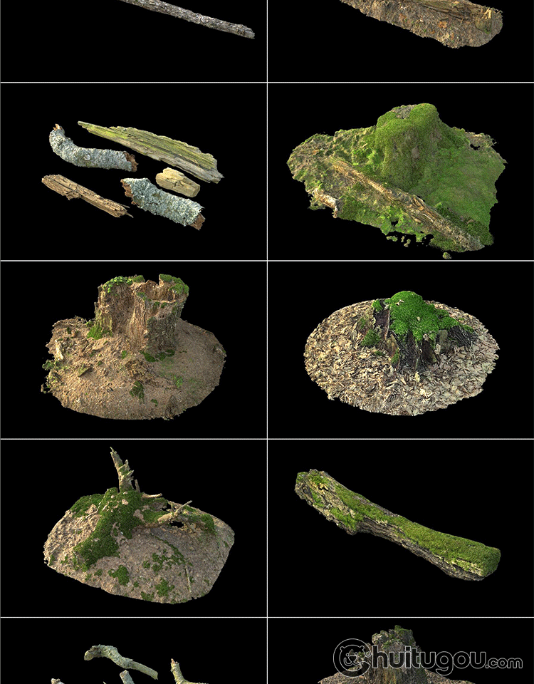 C4D写实树枝朽木树桩3D模型森林石头干枝木块苔藓OBJ格式渲染素材