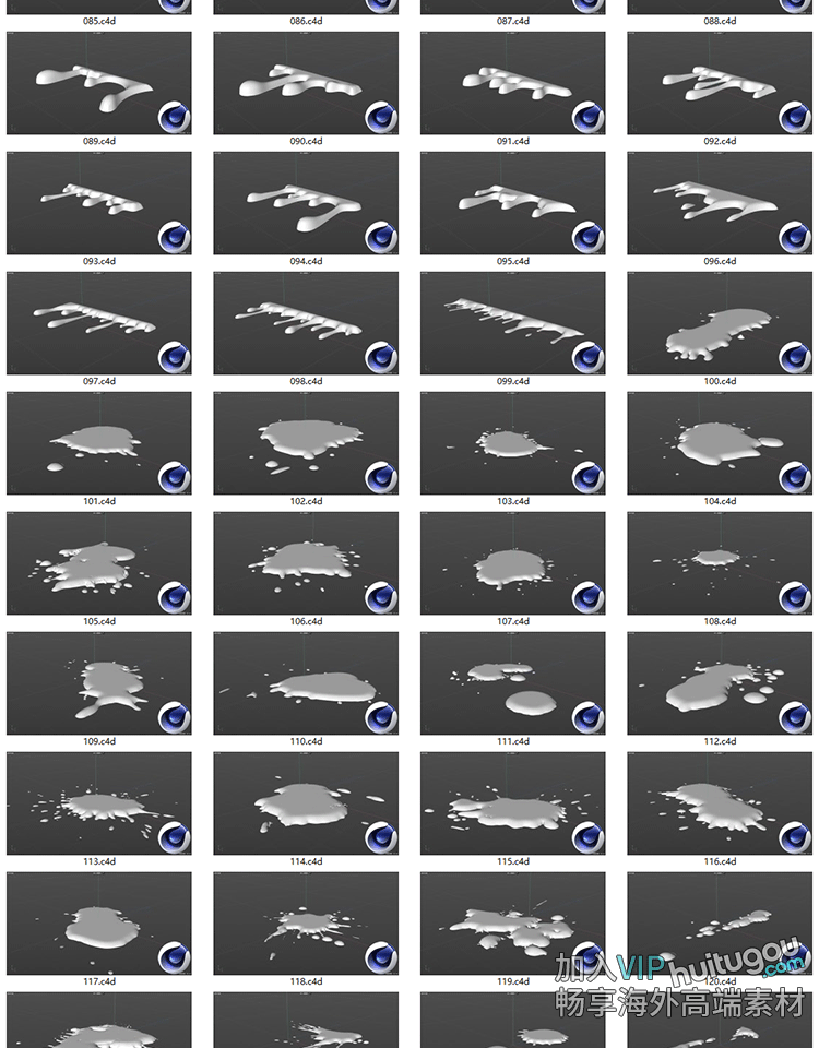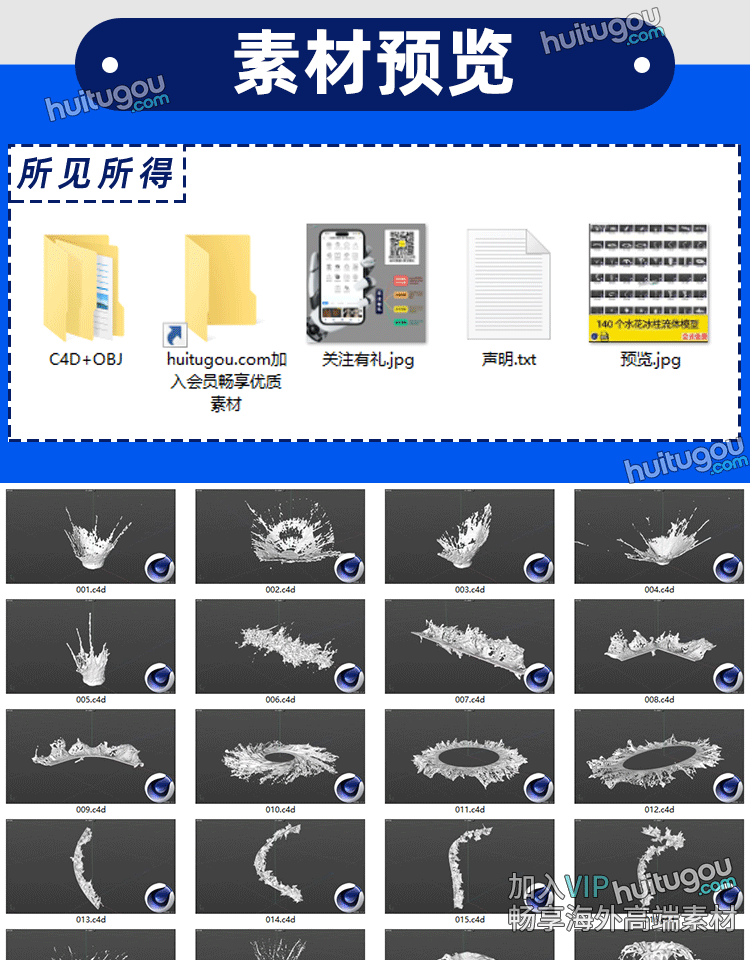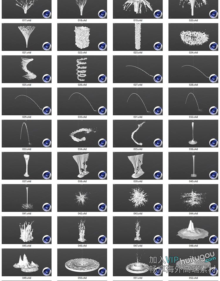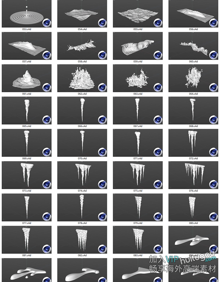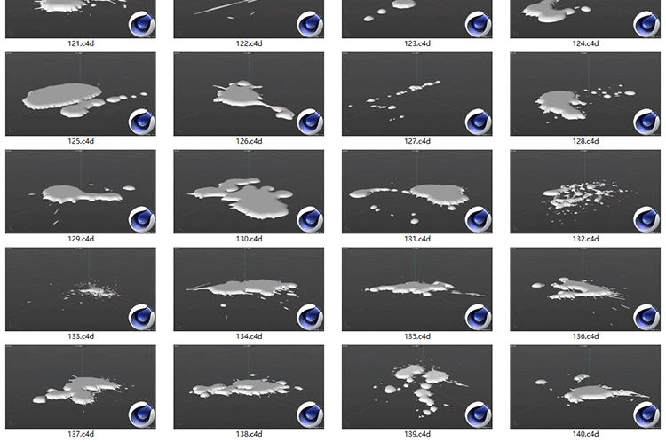 140个C4D水花冰柱流体冰涟漪喷溅液体3D模型基础白模OBJ格式素材