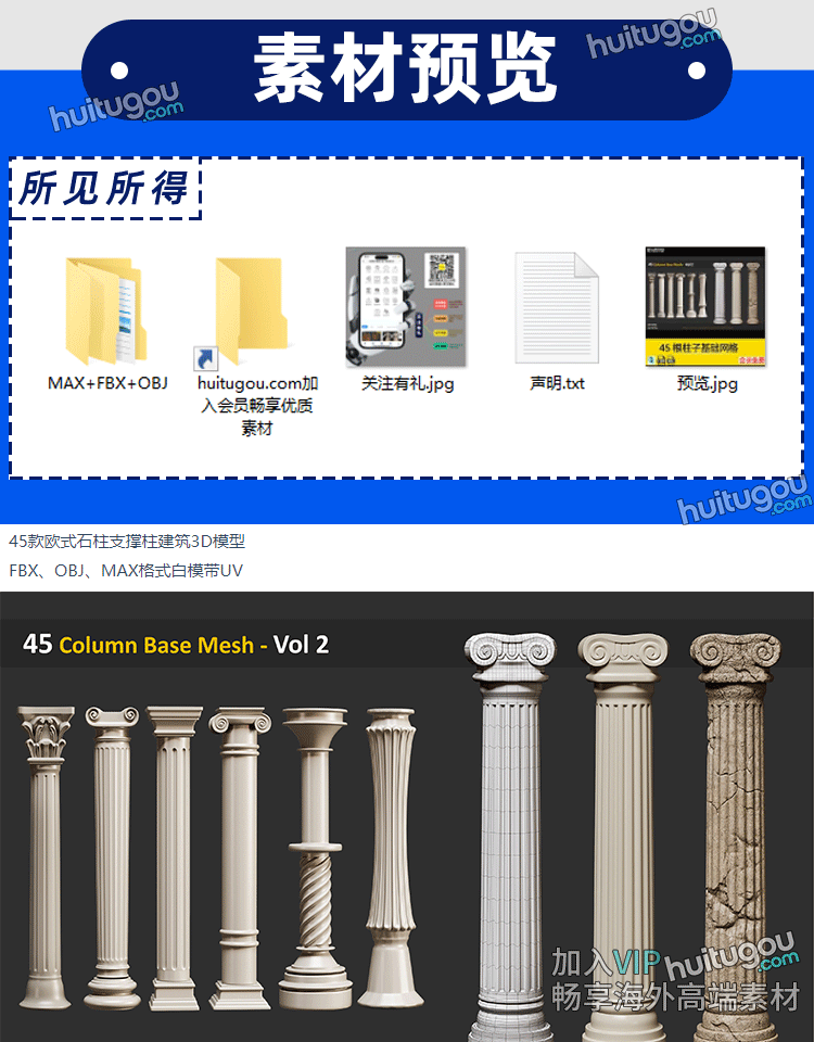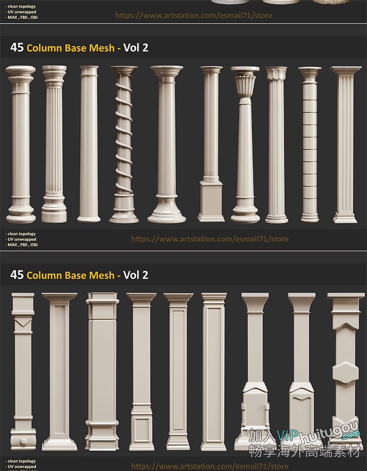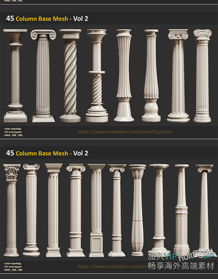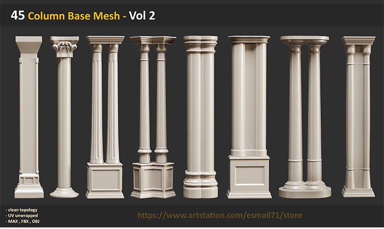 45根3dsMAX建筑柱子基础网格白模3D模型建模渲染素材FBX格式OBJ