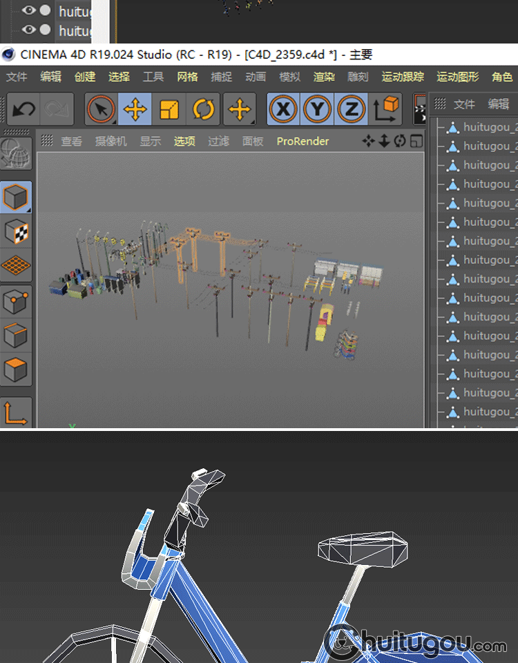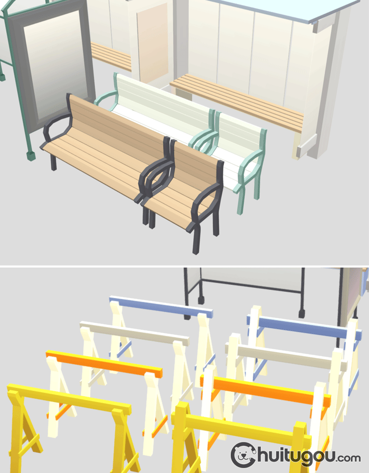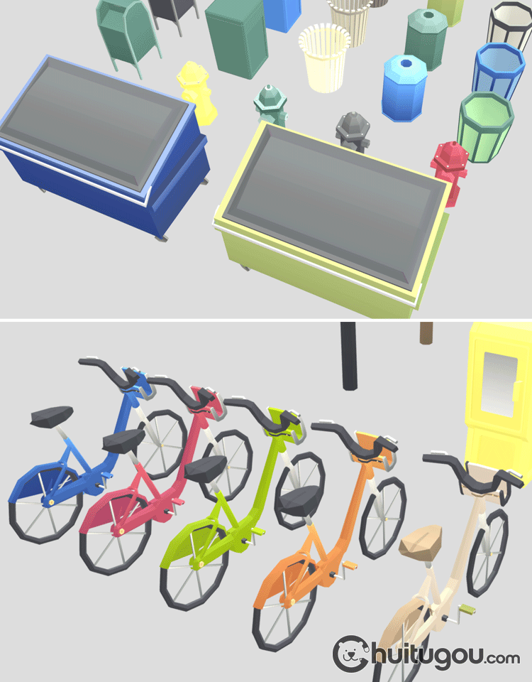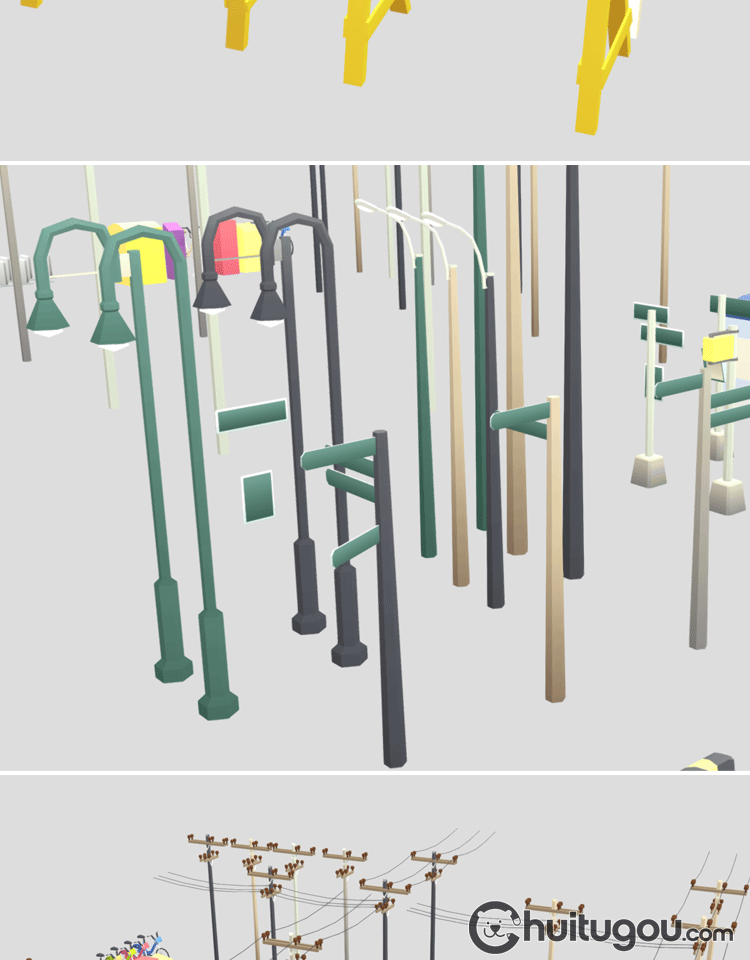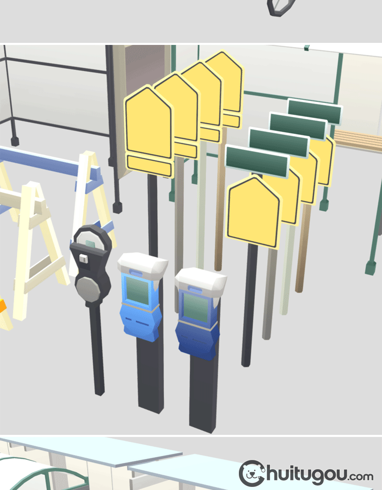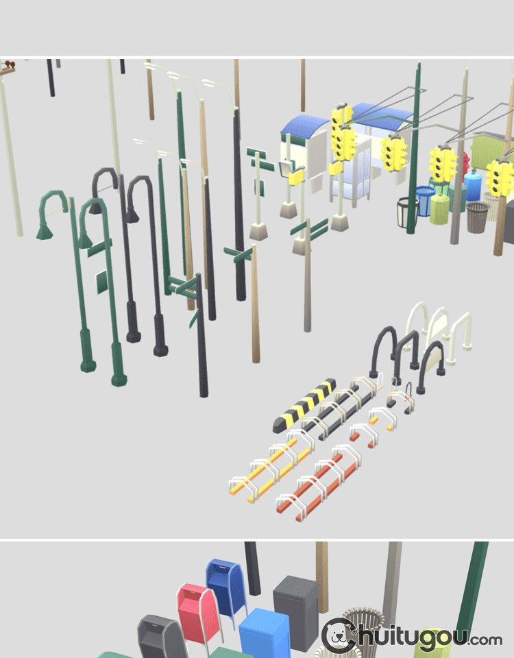 卡通马路资产C4D电线杆公交站红绿灯路牌垃圾桶自行车室外椅子OBJ