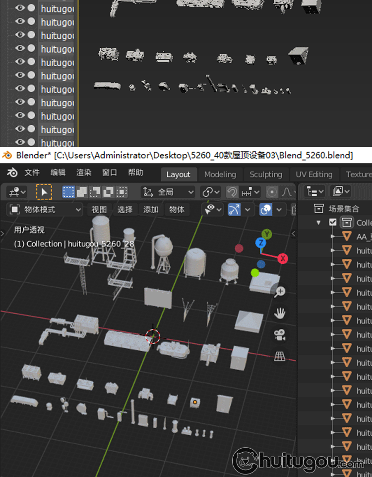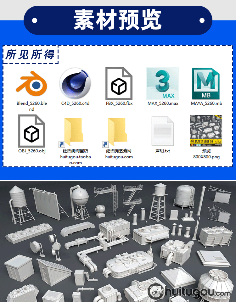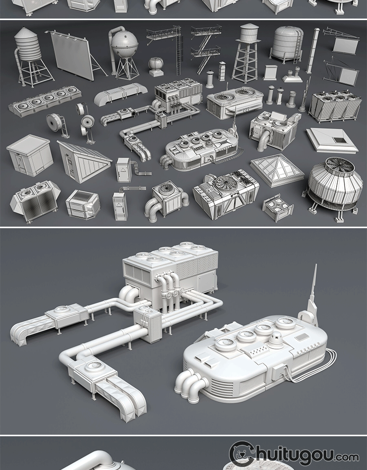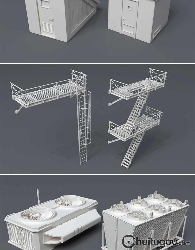 3D屋顶楼顶设施Blender管道广告牌MAYA爬梯蓄水池排风机烟囱口OBJ