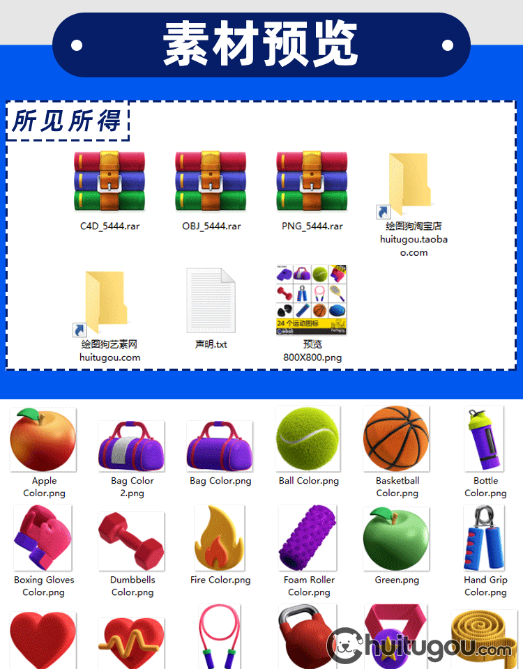 C4D运动器材三维ICON图标附免扣PNG素材OBJ模型 篮球网球哑铃拳套