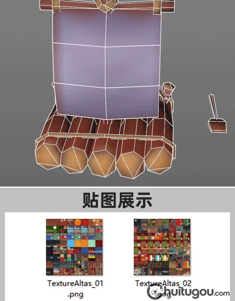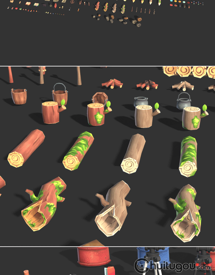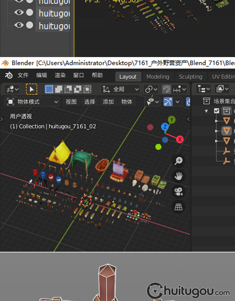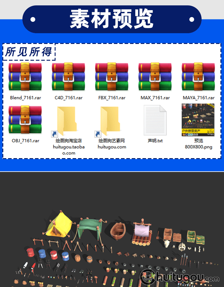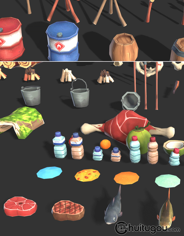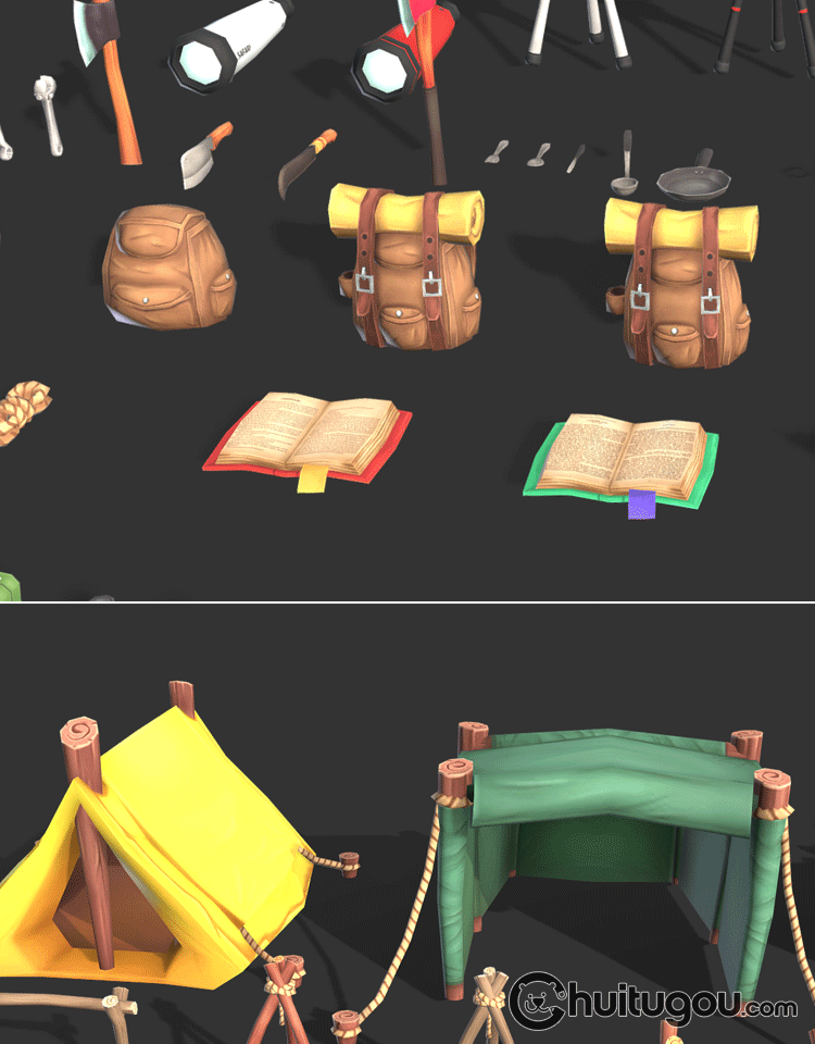 Blender生存游戏资产包3D模型C4D低模手绘风格MAX背包帐篷木筏FBX