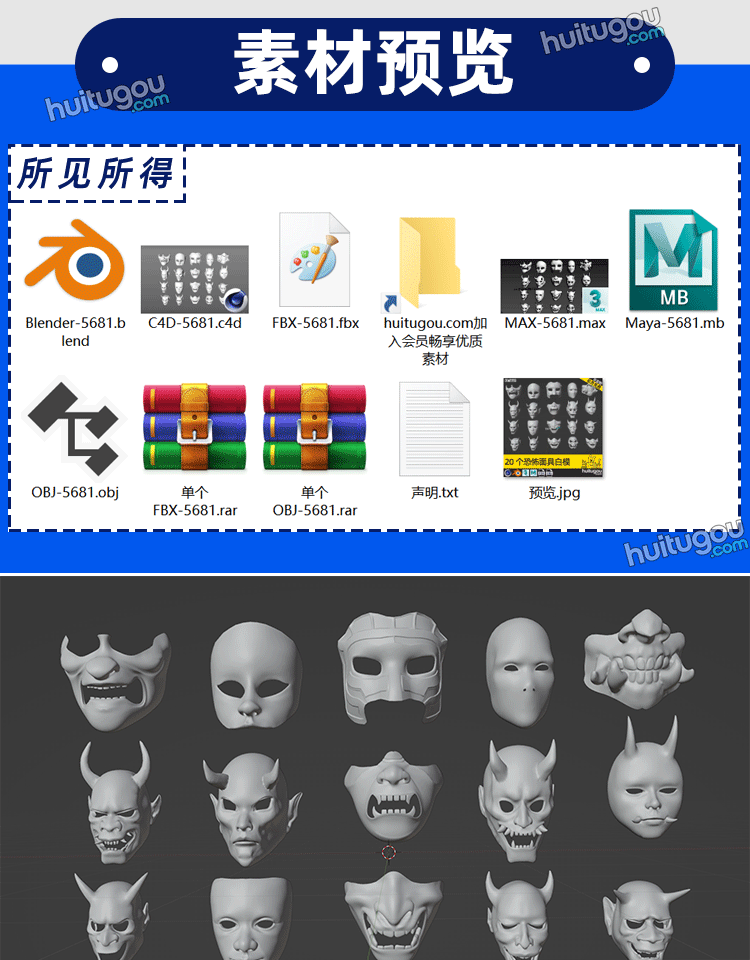 C4D恐怖面罩面具3D模型单体Blend建模渲染设计素材FBX格式OBJ文件