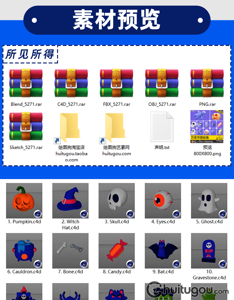 blender卡通万圣节日图标C4D糖果蝙蝠南瓜FBX蜘蛛骷髅OBJ素材文件