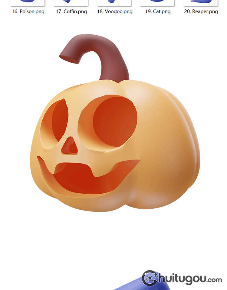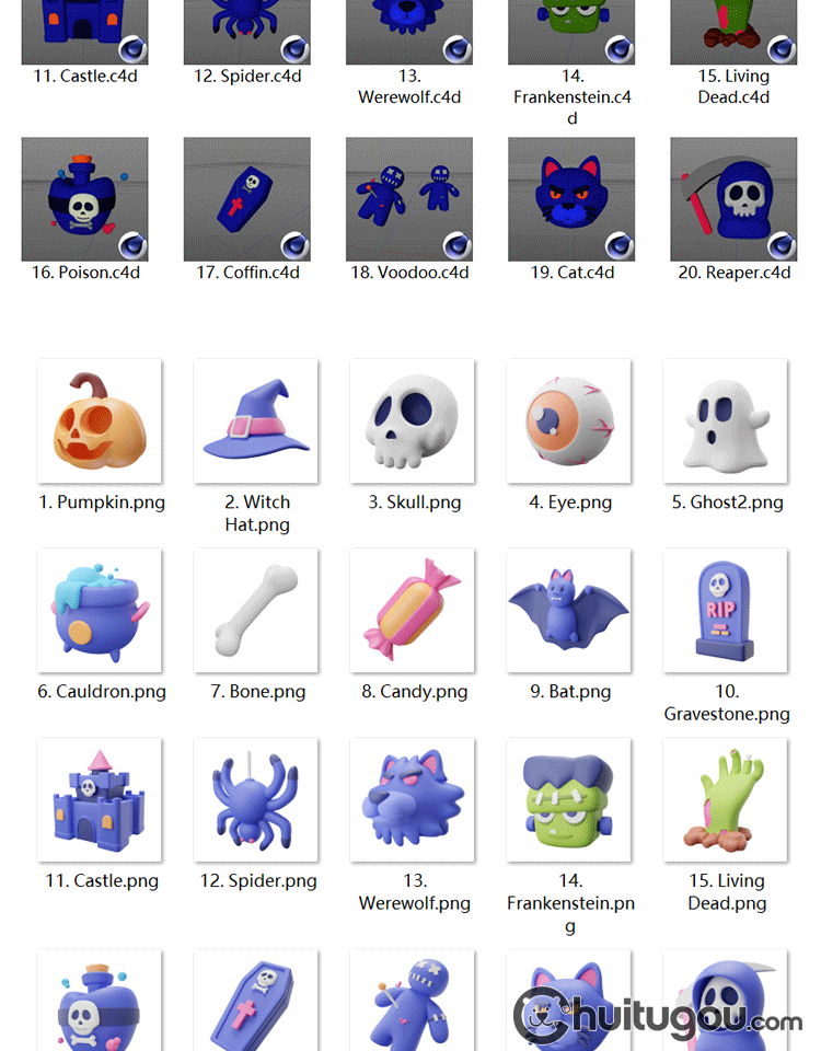 卡通万圣节图标3D模型C4D骷髅南瓜蝙蝠OBJ蜘蛛幽灵素材文件附PNG