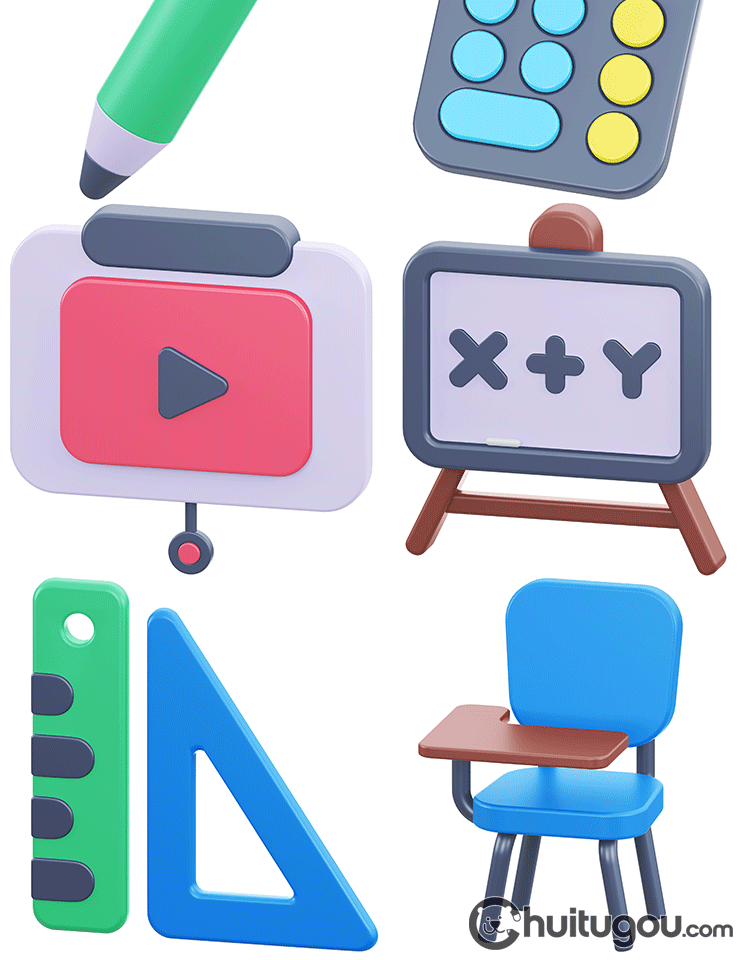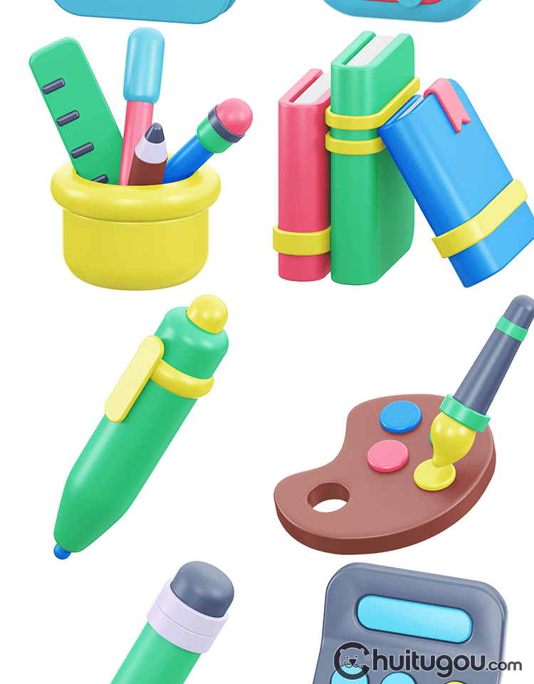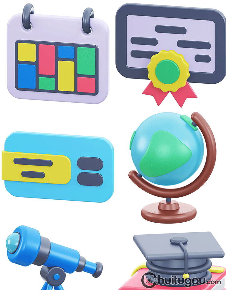 Q版教育图标3D模型附PNG卡通C4D书本调色盘日历计算器黑板学校OBJ