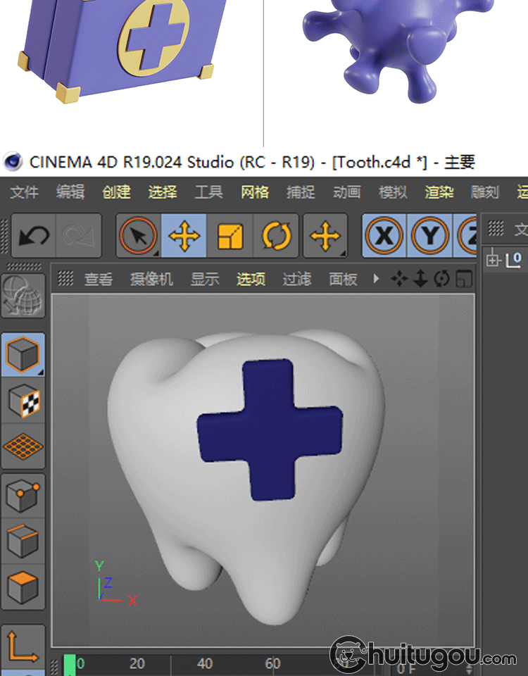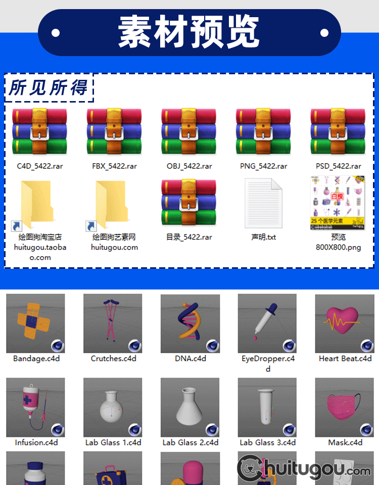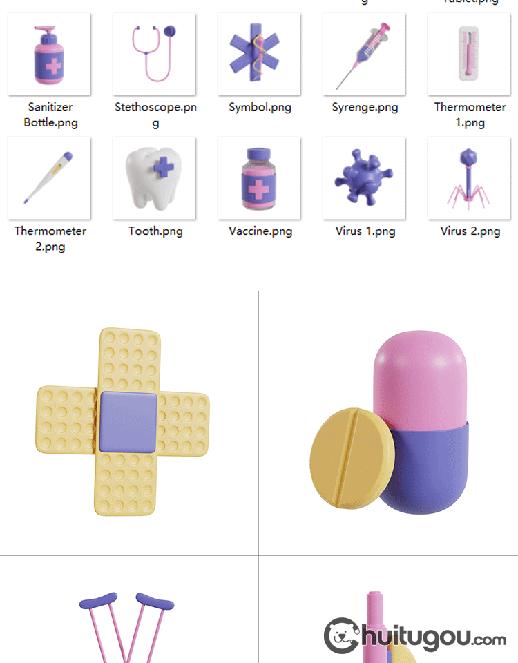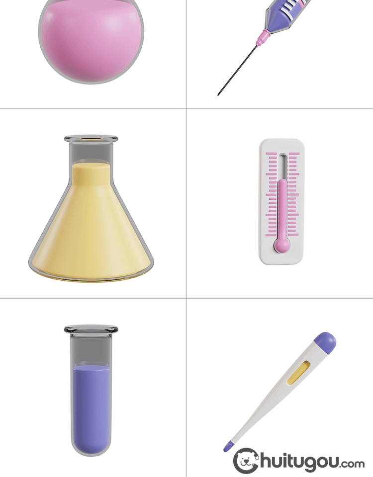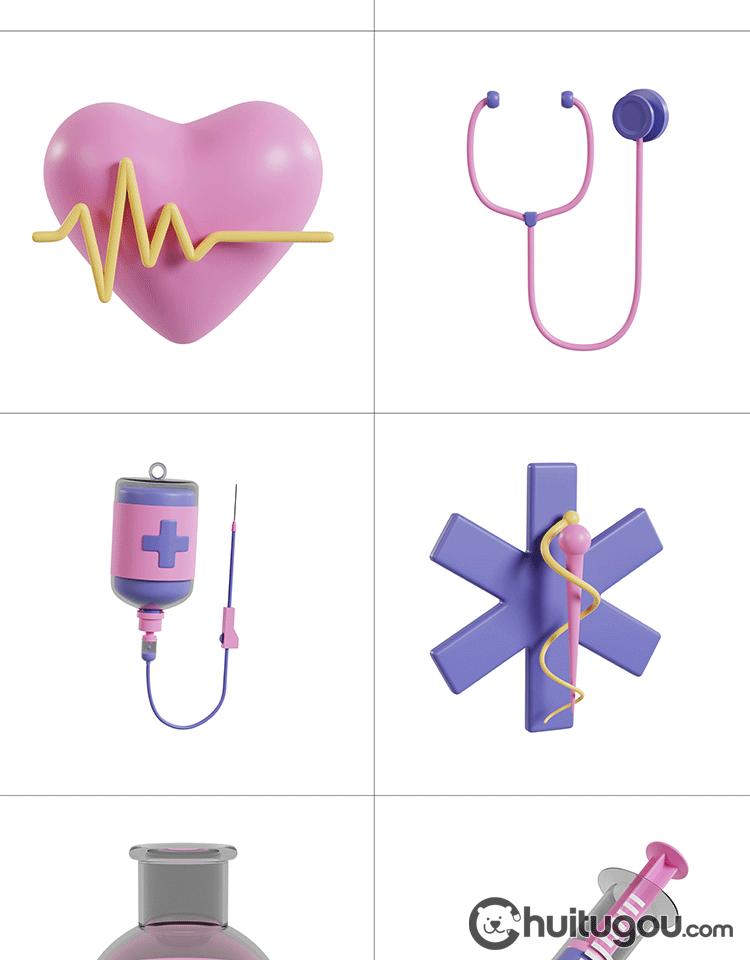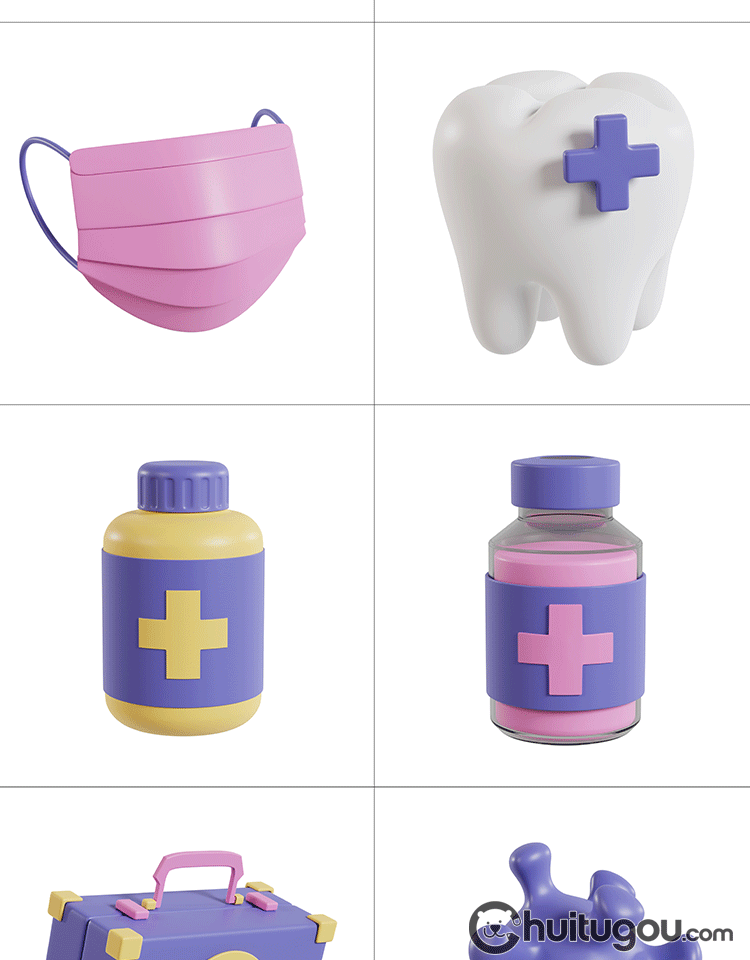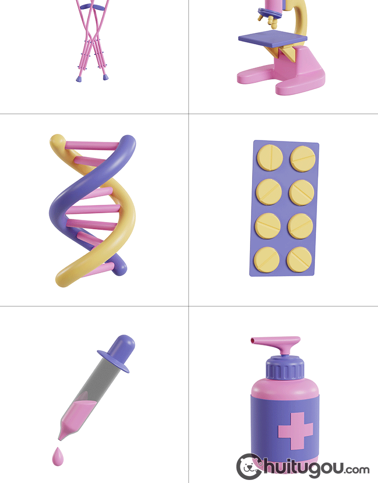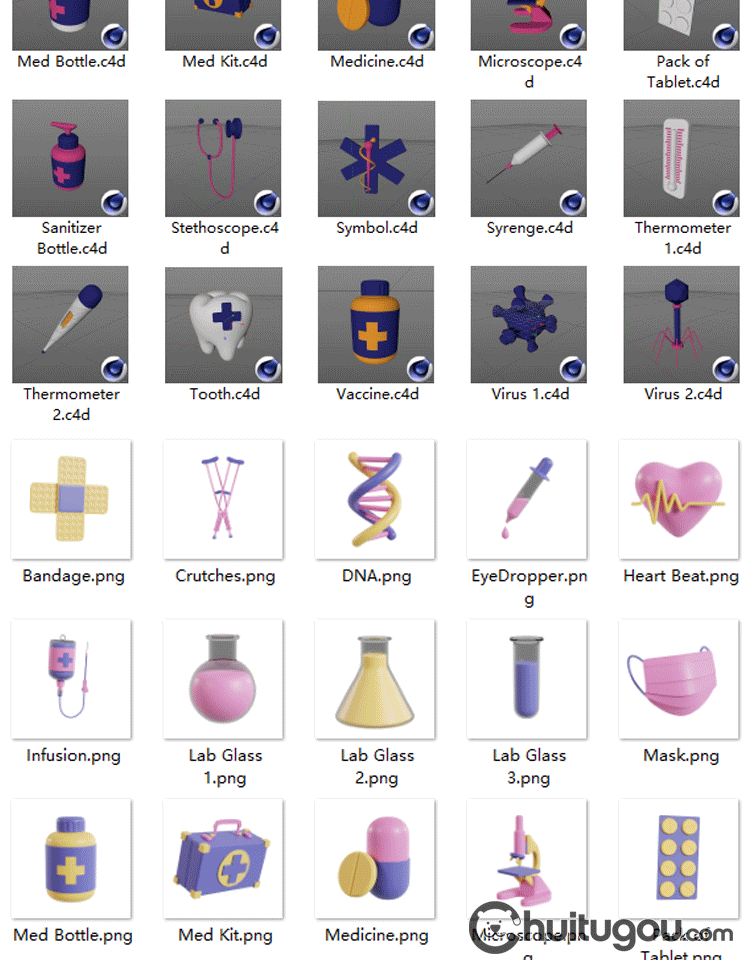 C4D医学标识ICON图标模型附png创可贴拐杖药瓶药箱显微镜试管OBJ