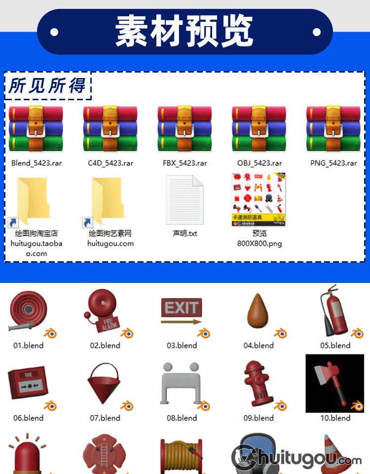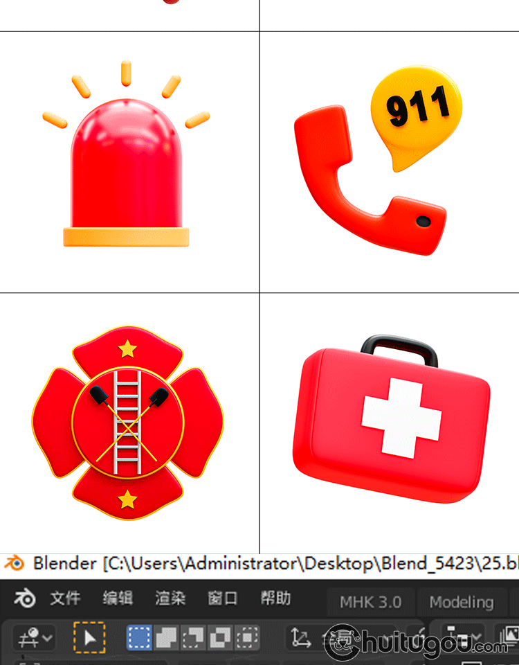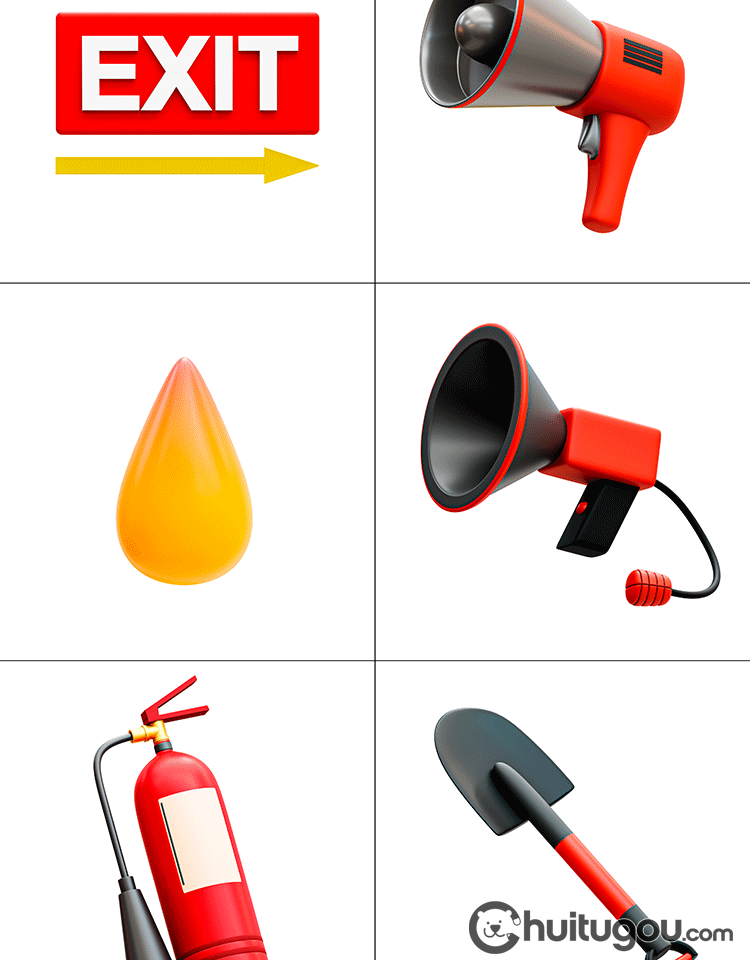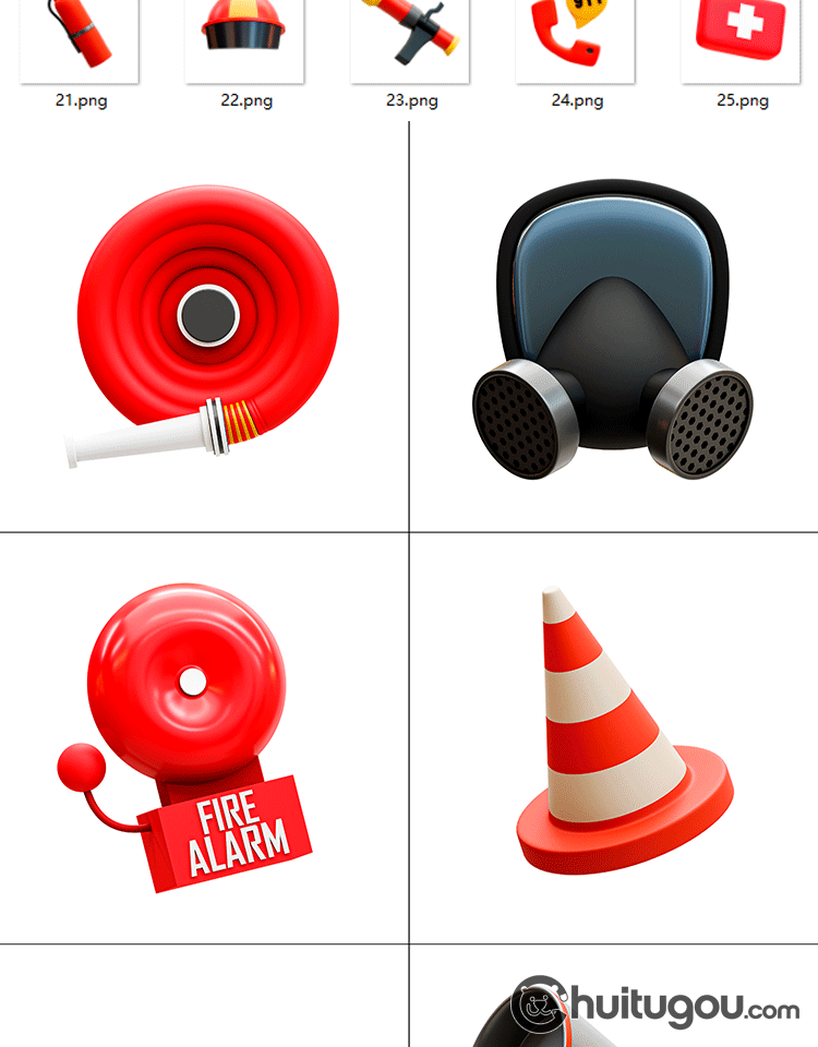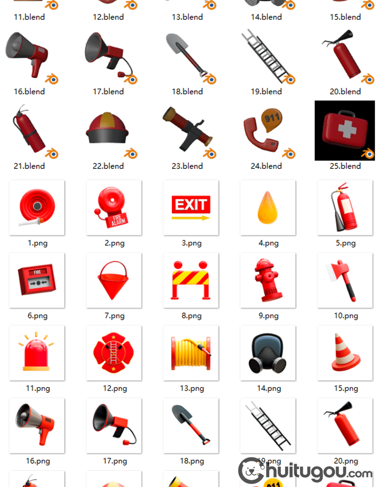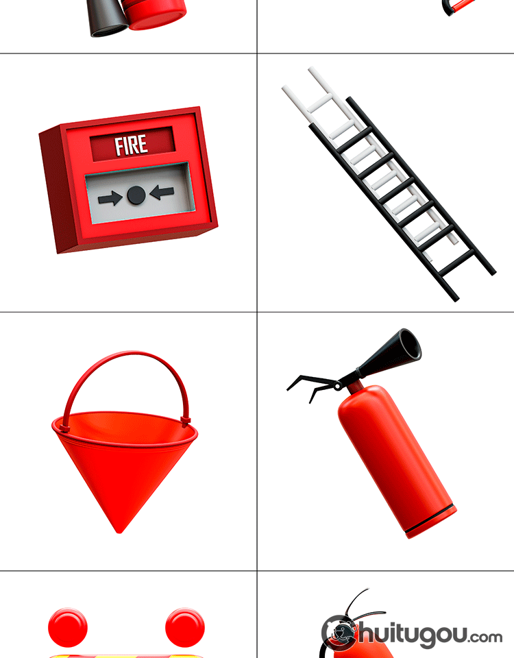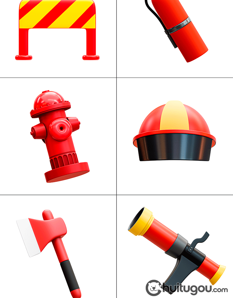 C4D卡通消防图标3D模型附png消防栓水管梯子FBX灭火器喇叭铲子OBJ