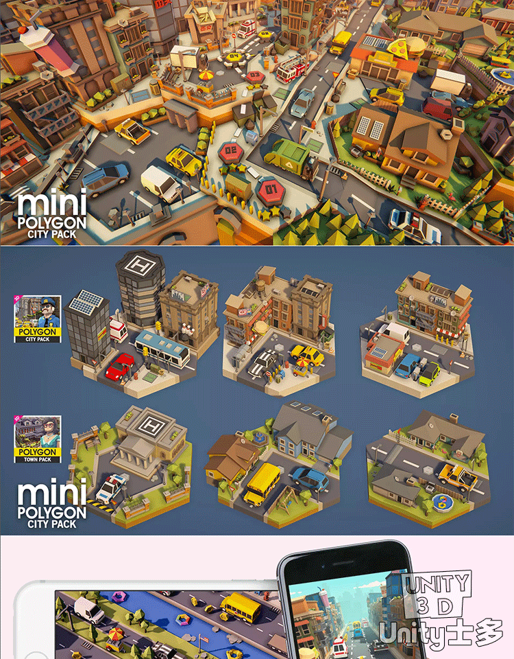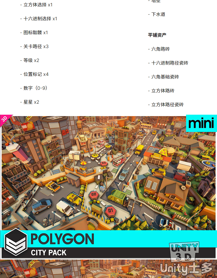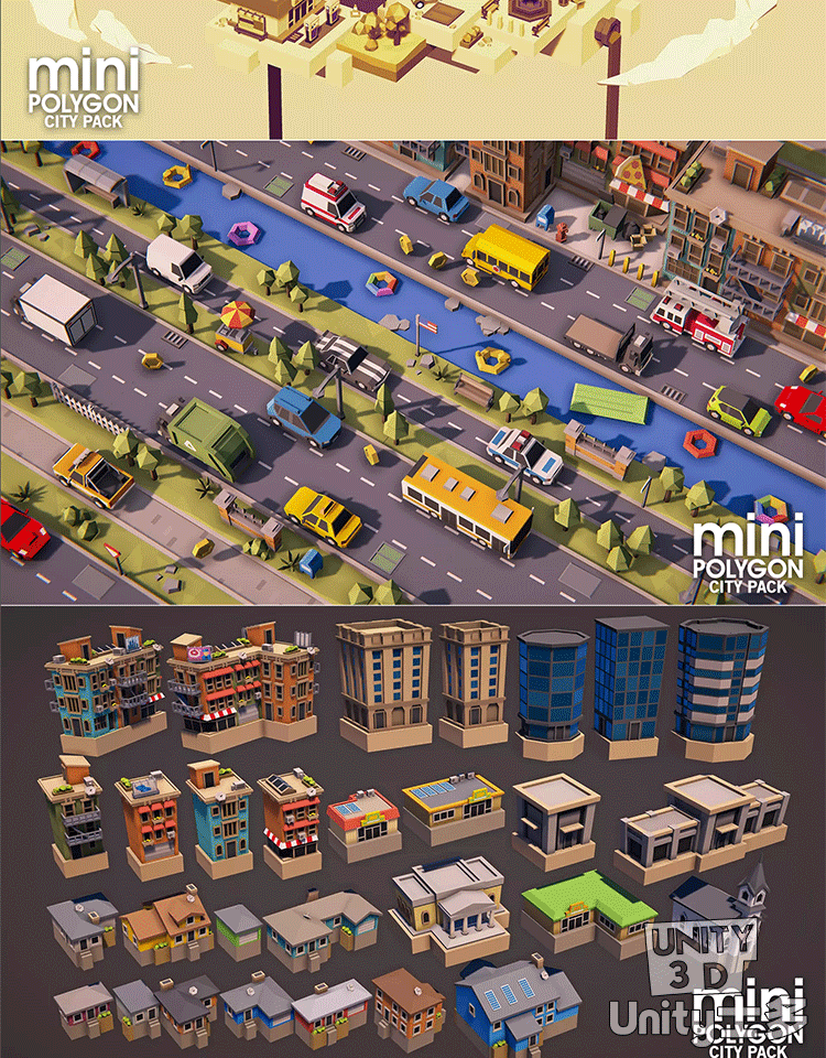 Unity3D微缩城市游戏模型U3D低面建筑车辆POLYGON MINI City Pack