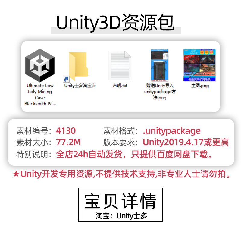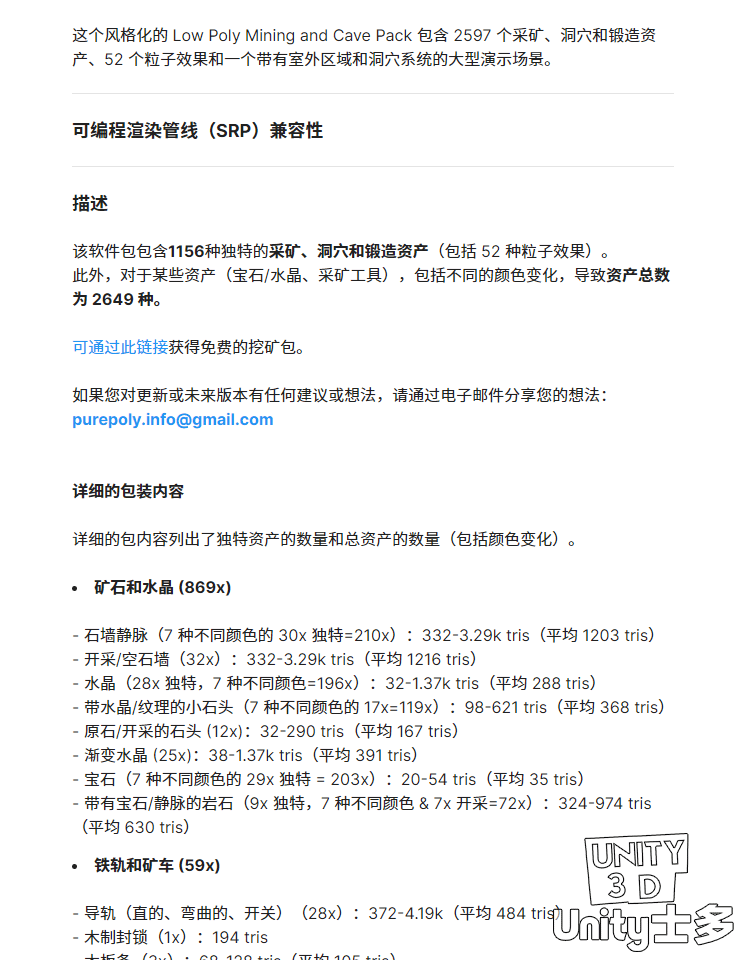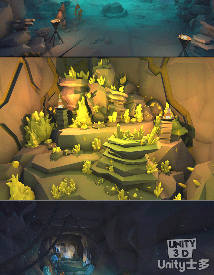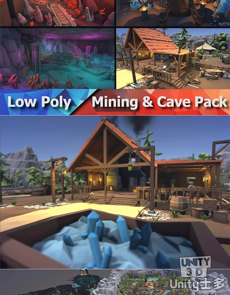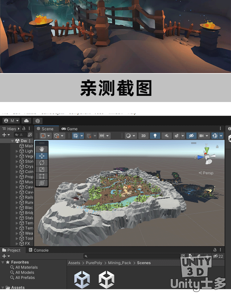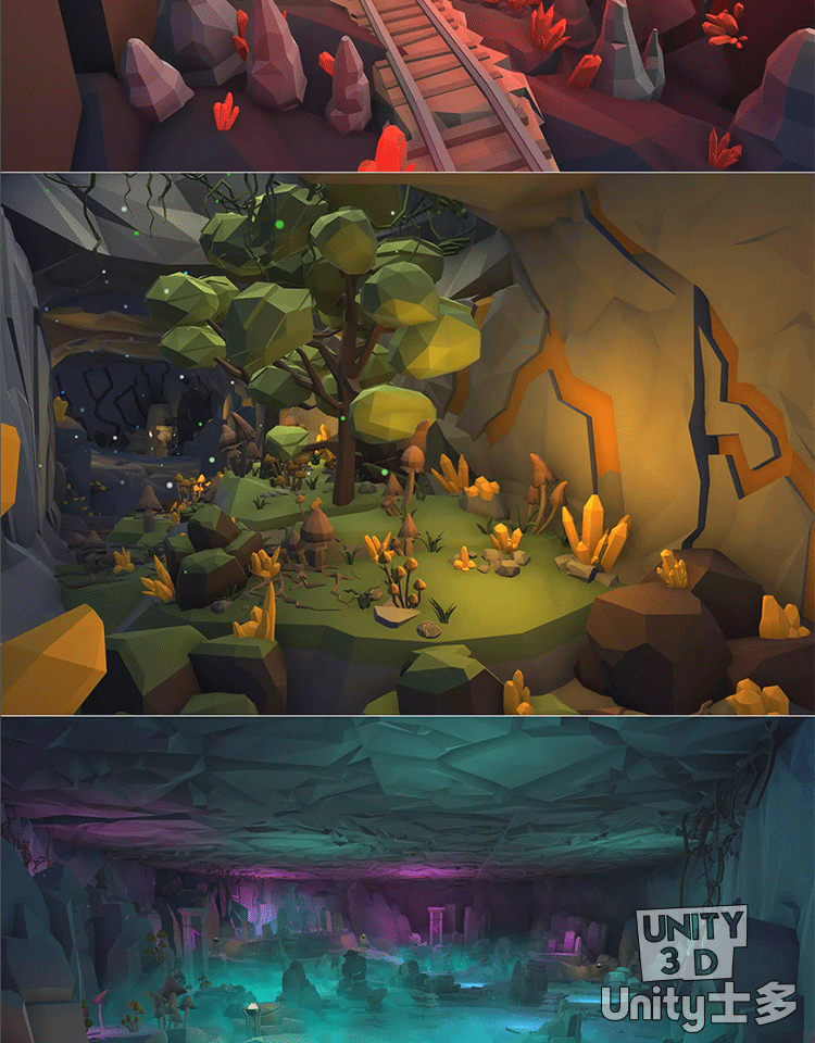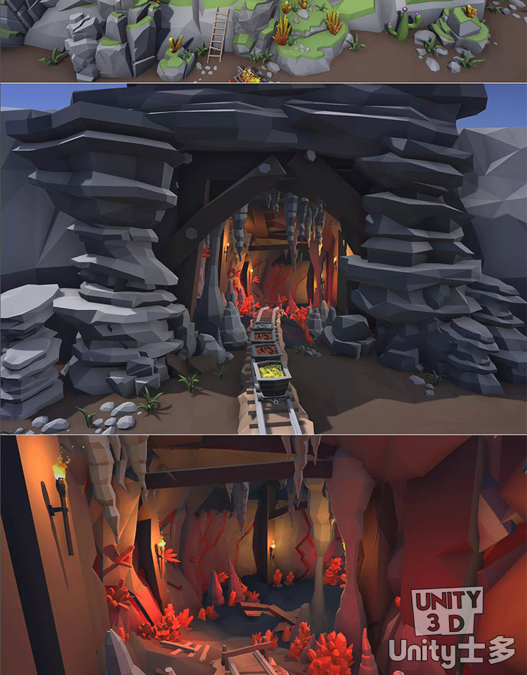 Unity洞穴挖矿游戏场景U3D水晶铁轨矿车工具植物岩石Mining Cave