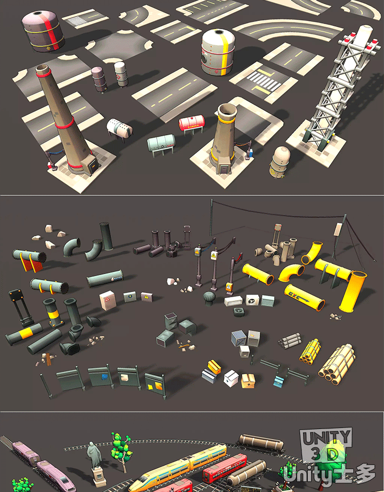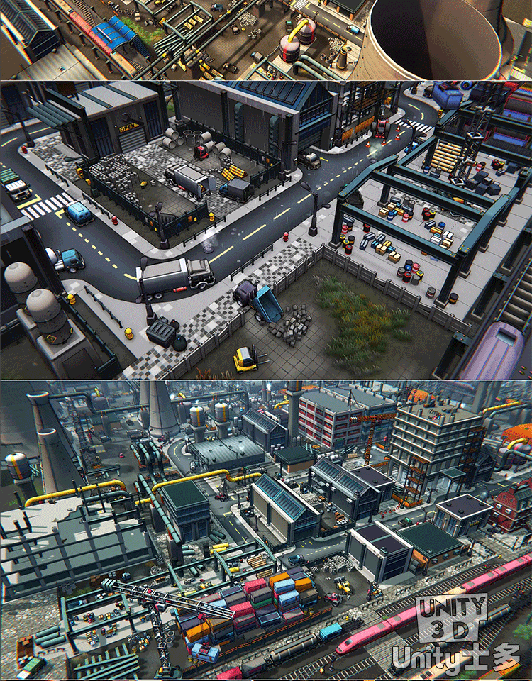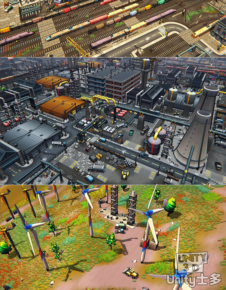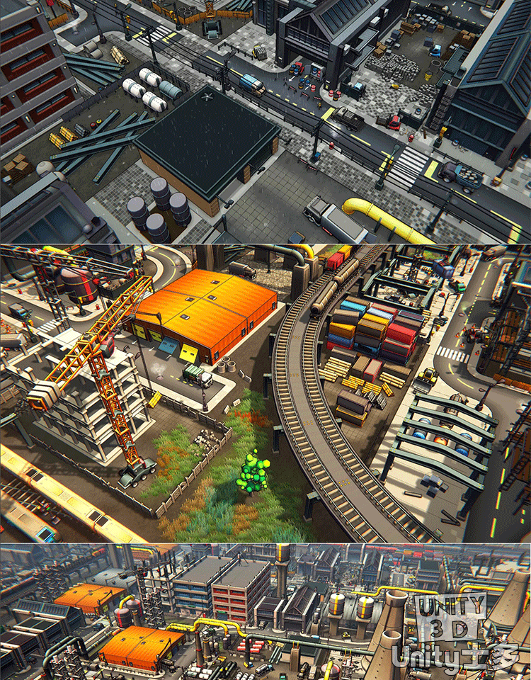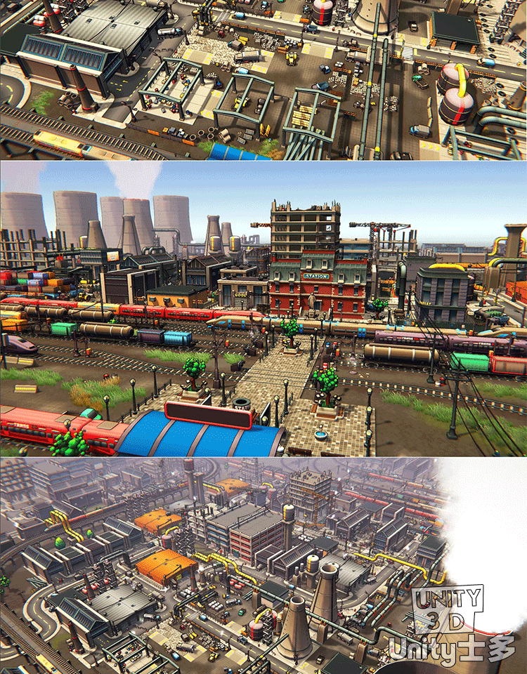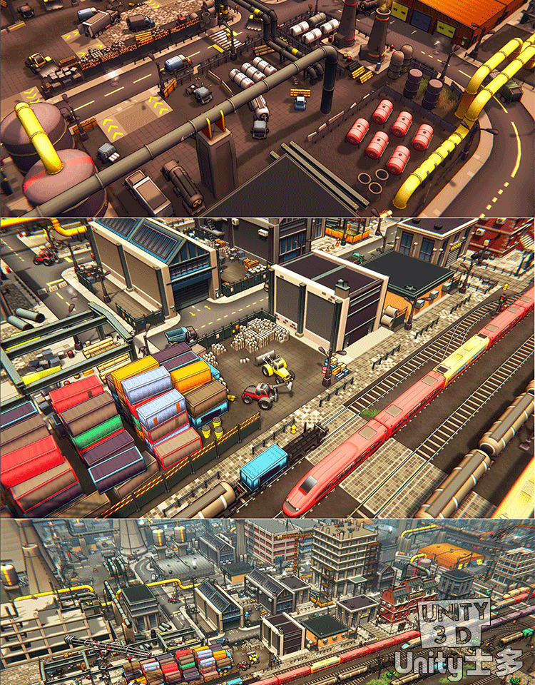 Unity3D卡通工业区场景厂房车辆道路火车铁路道具Toon Industries