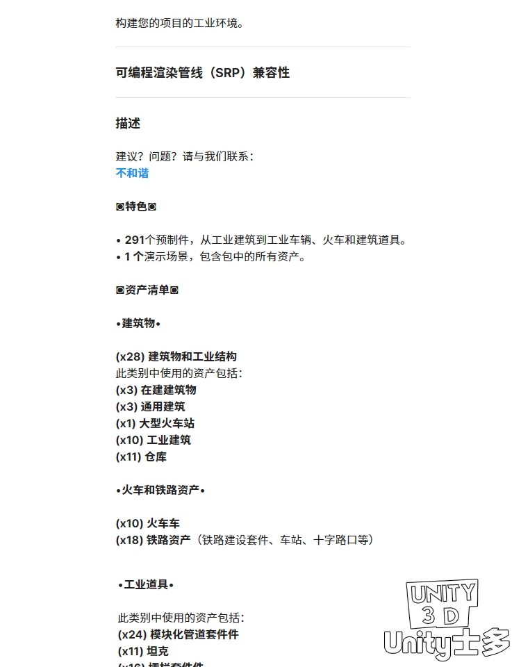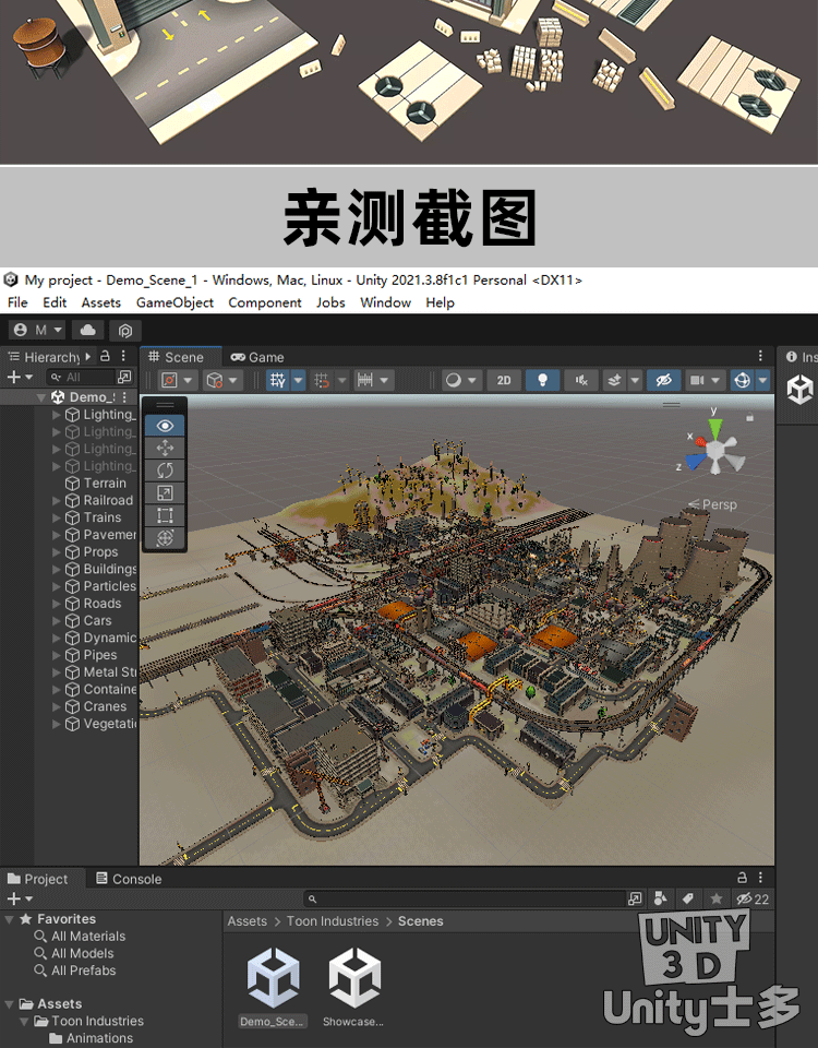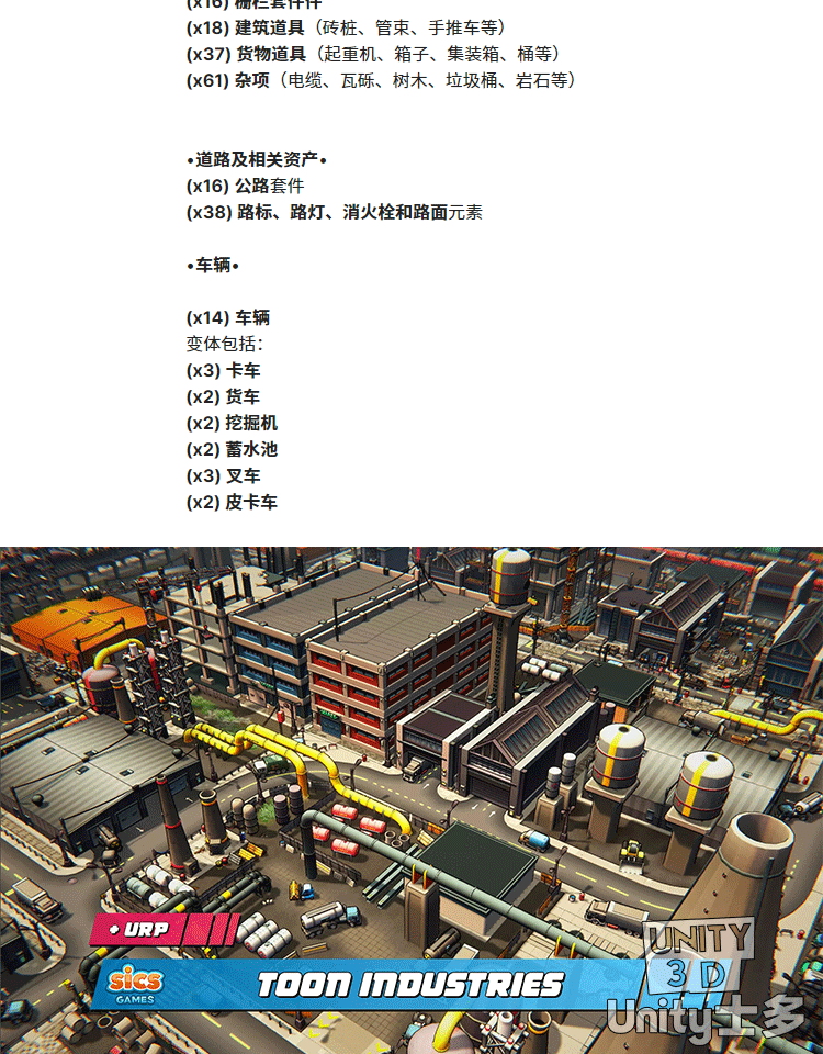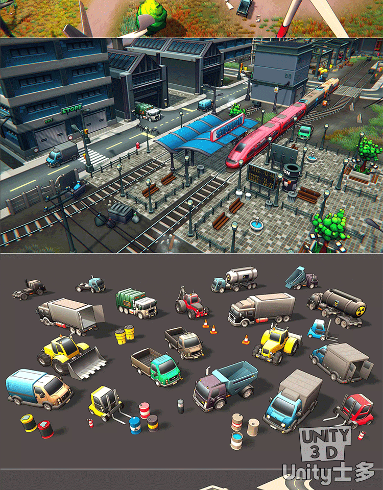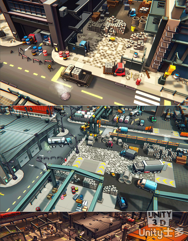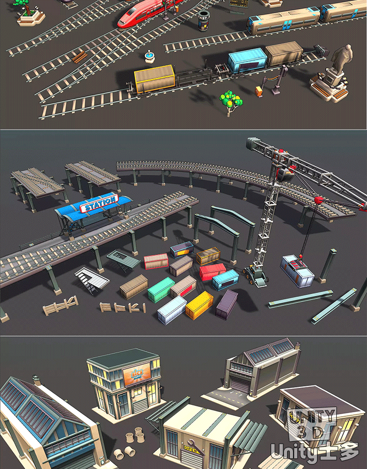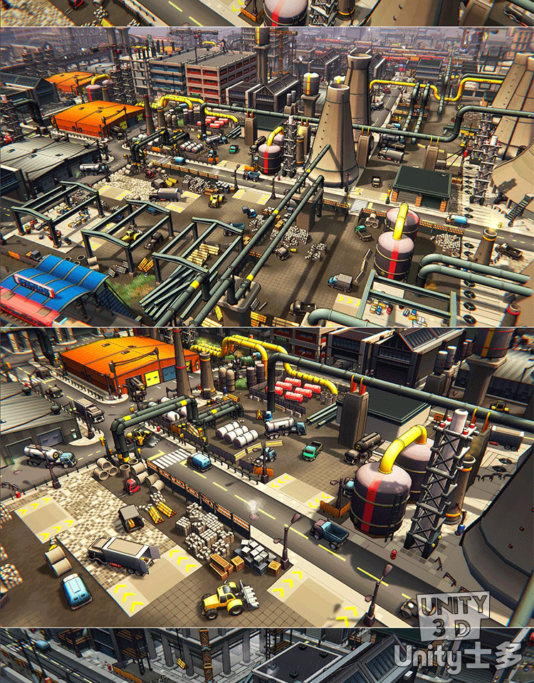 Unity3D卡通工业区场景厂房车辆道路火车铁路道具Toon Industries