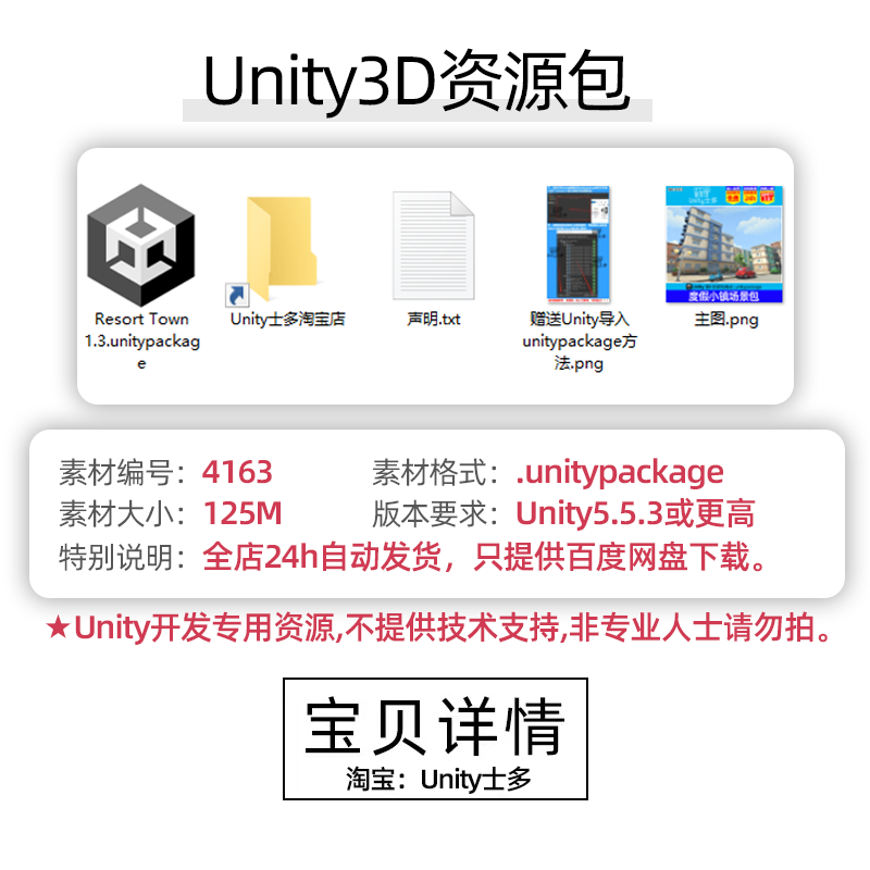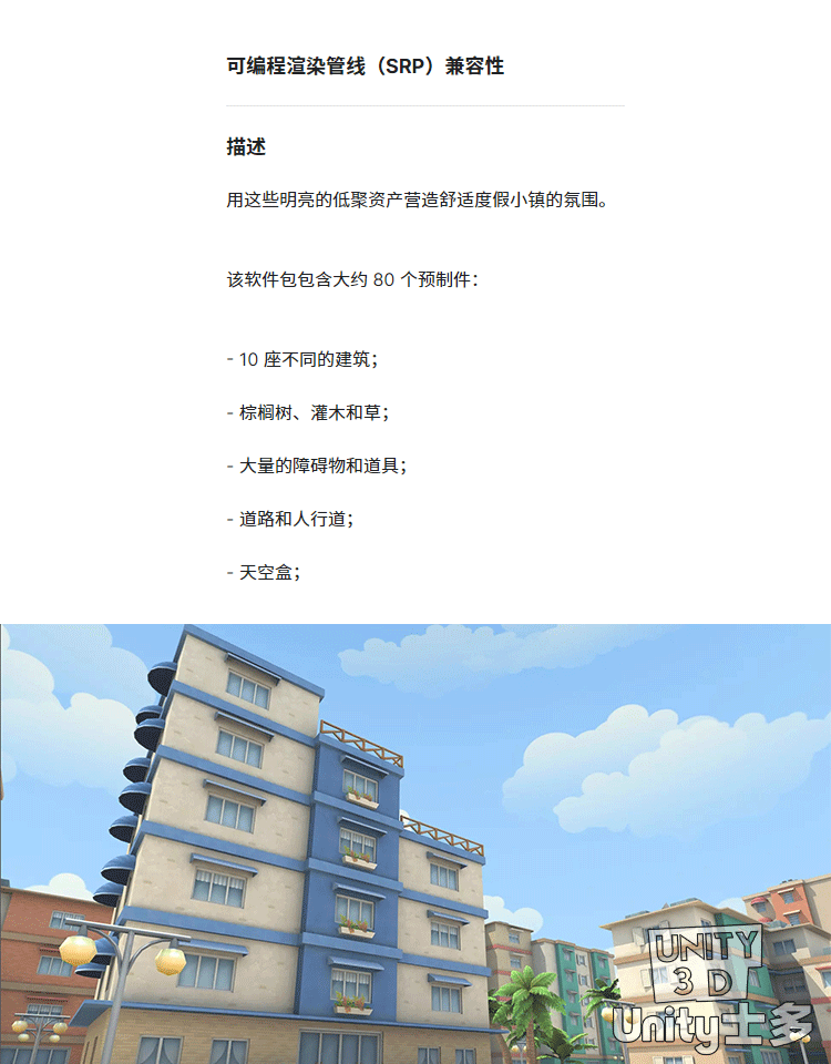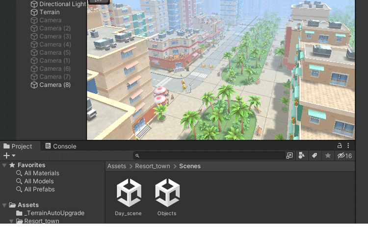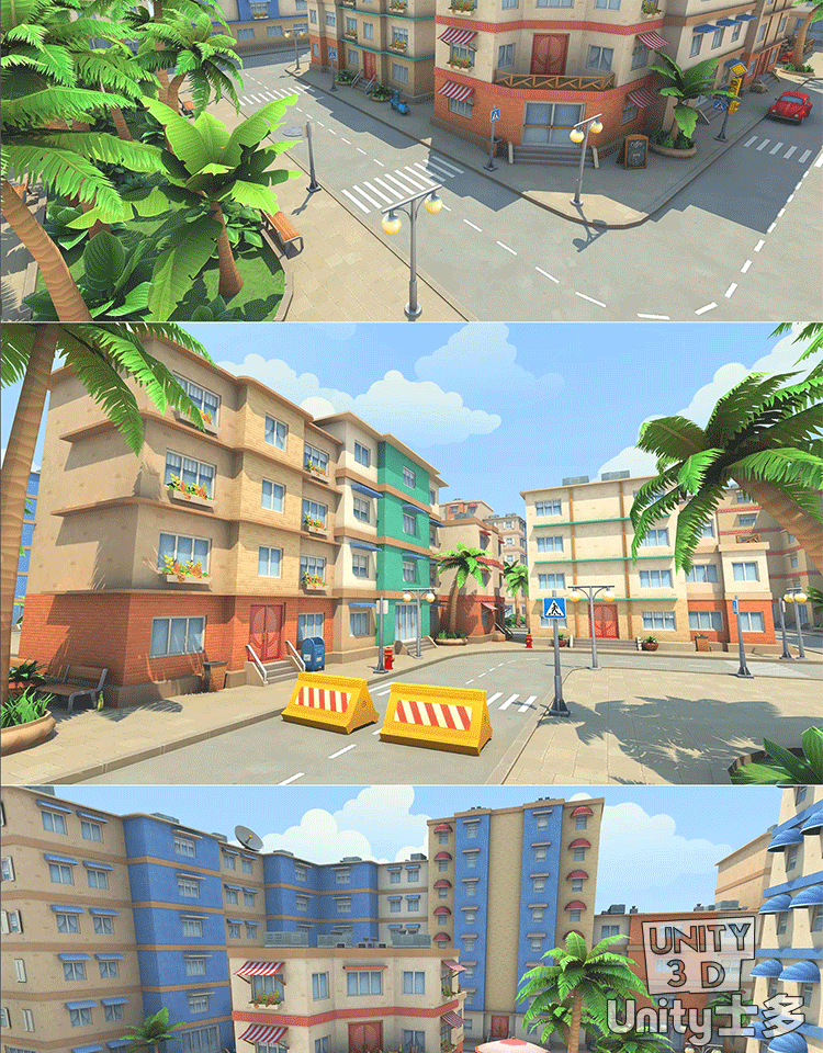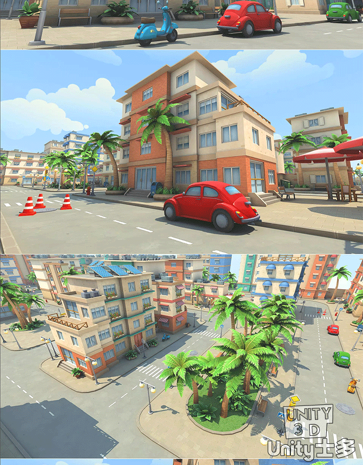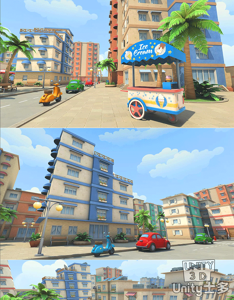 Unity3D卡通风格旅游度假小镇建筑U3D棕榈树道路车辆Resort Town