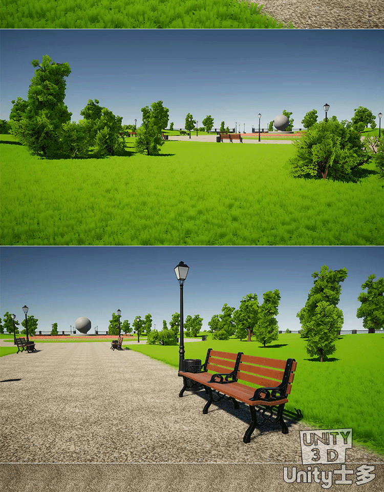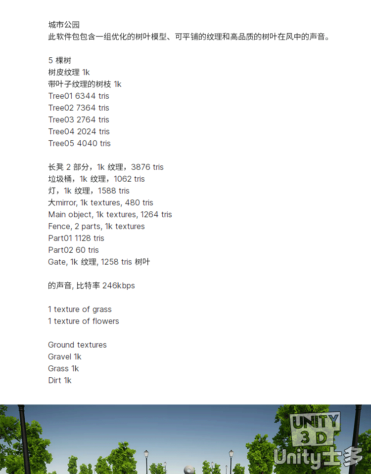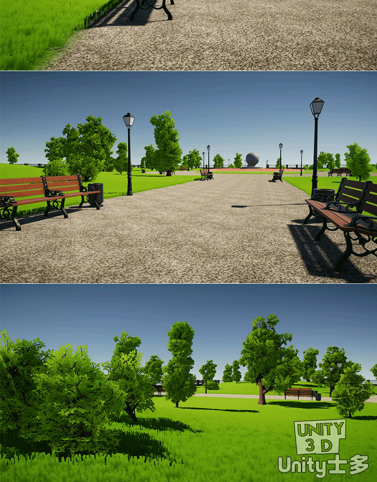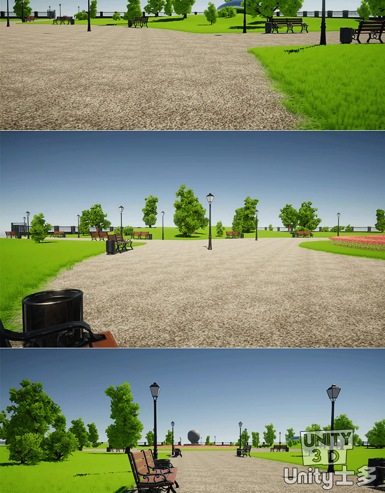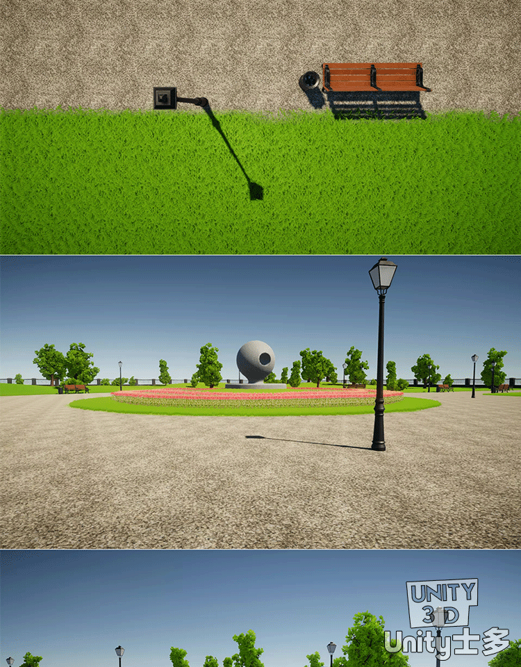 Unity城市绿草地公园场景U3D树木植物草坪长椅路灯City park 1.0