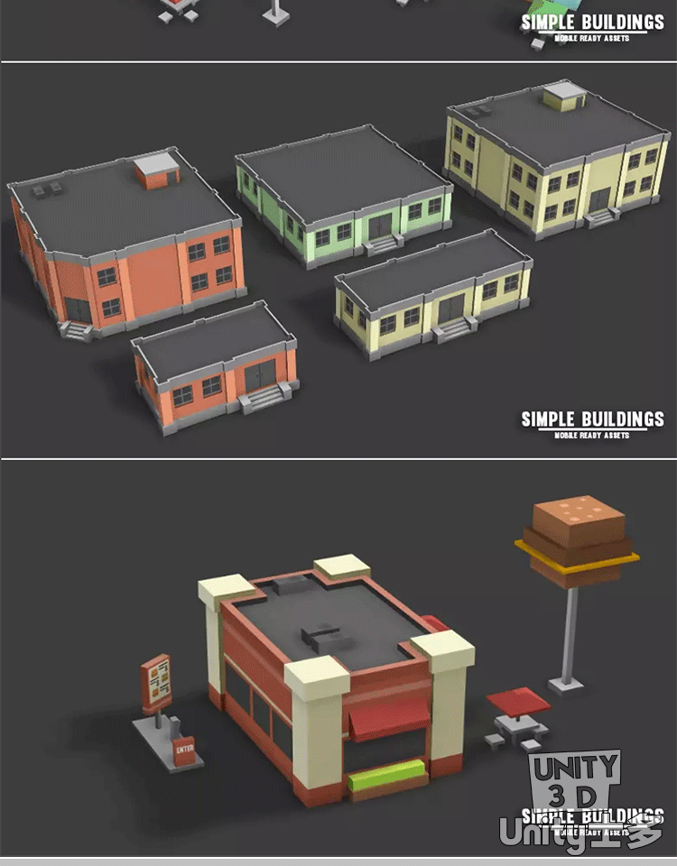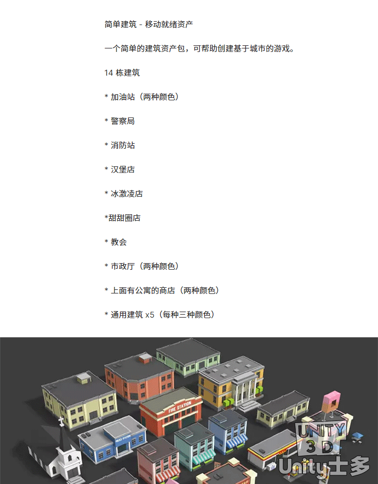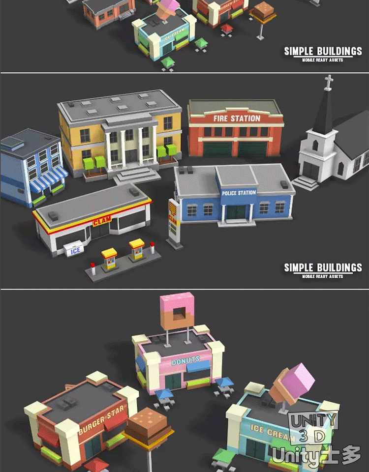 Unity简单卡通建筑模型资产U3D商店警察局加油站Simple Buildings