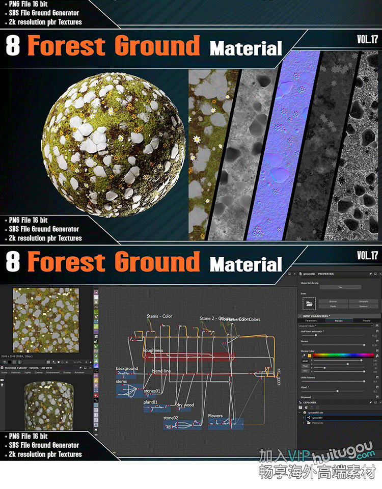 SP/Pt/SD材质6款风格化花草石头草坪地面sbsar材质球带PBR纹理图