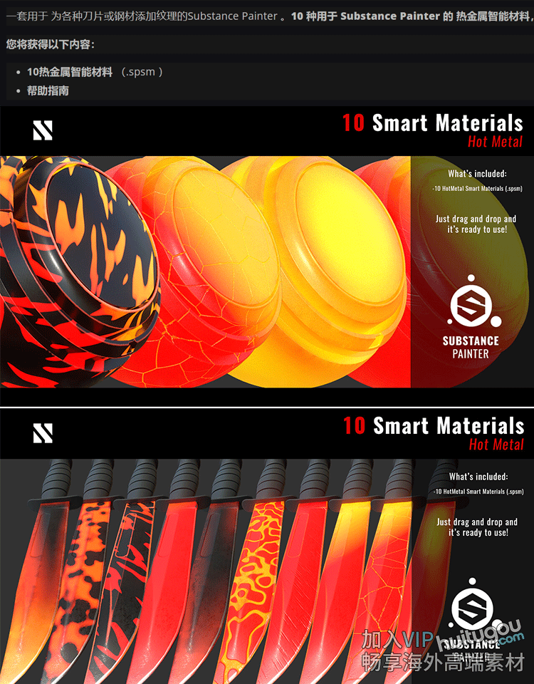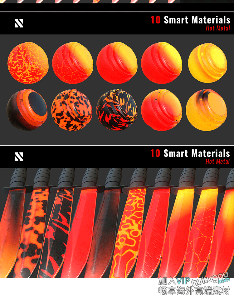 SP/Pt智能材质10款铁水烧红金属刀具钢材锻造SPSM材质球PBR素材