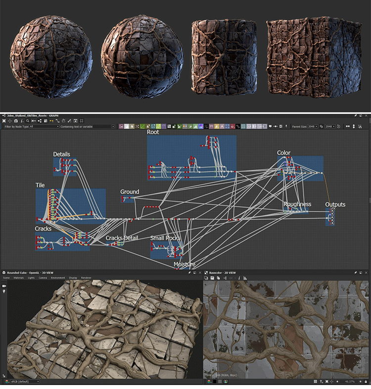 SD/DS源文件SBS格式1款SD风格化树根缠绕地面瓷砖PBR材质纹理素材