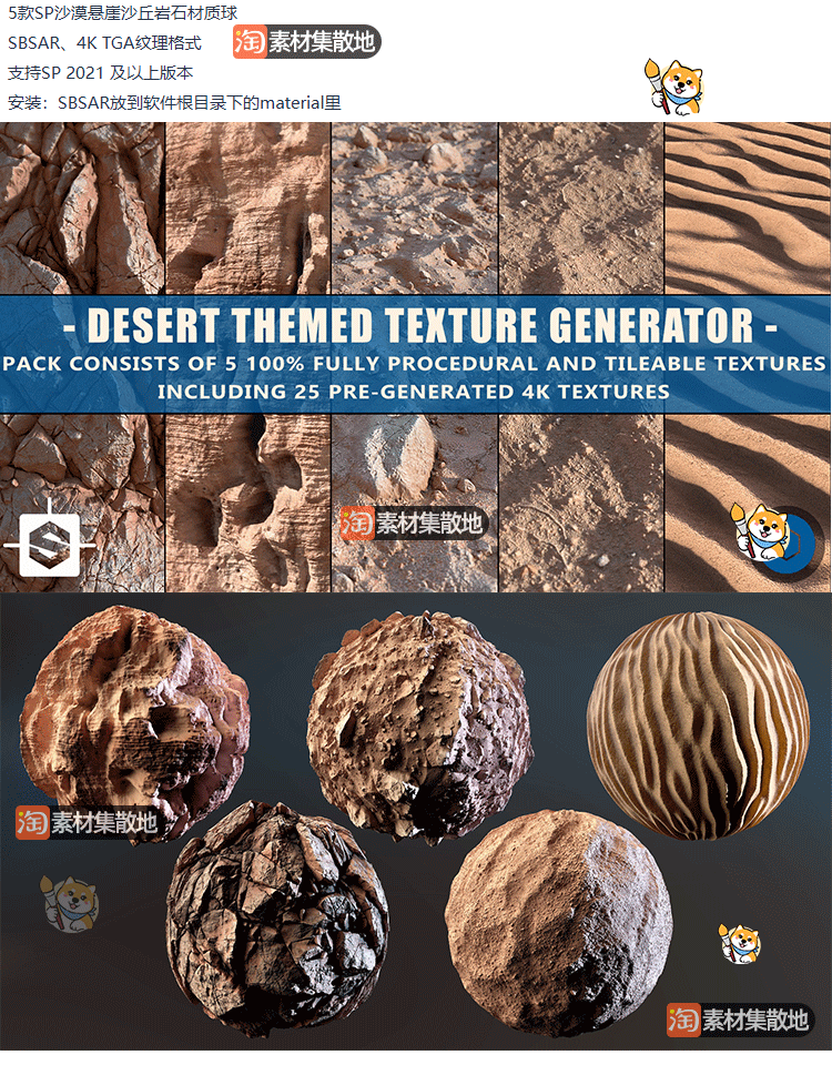 5款substance painter/SP/Pt沙漠黄土砂石sbsar材质球附带tga贴图
