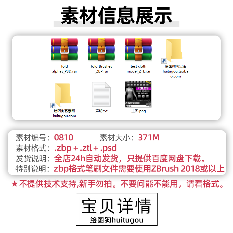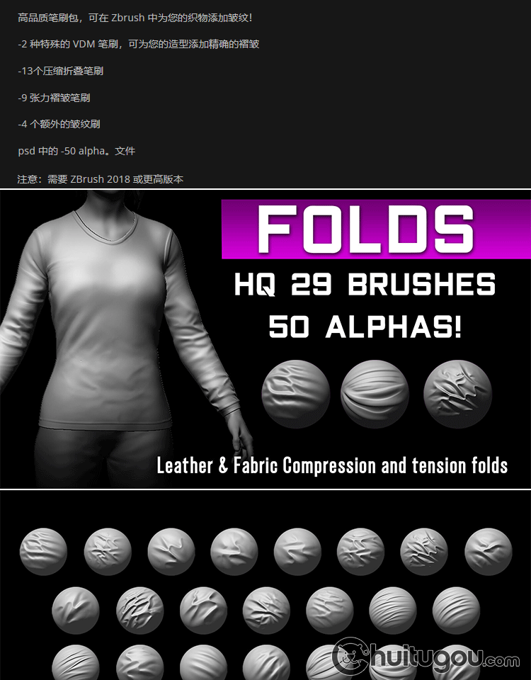 Zbrush衣服褶皱zbp笔刷VDM画笔布料折痕皱纹ztl雕刻psd格式Alpha