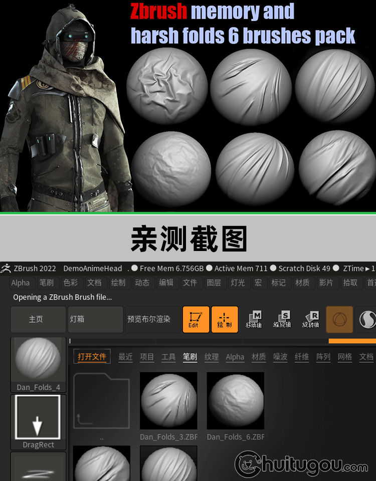Zbrush皮革织物布料压缩褶皱挤压折叠VDM笔刷ZB画笔Alpha纹理贴图