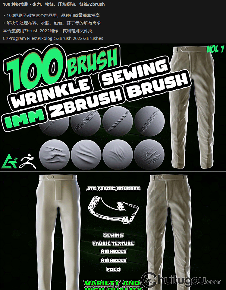 100个zbrush衣服织物布料褶皱缝纫线zbp笔刷ZB画笔 服装雕刻素材
