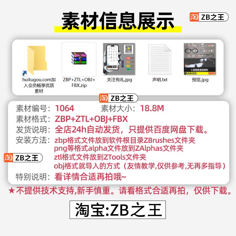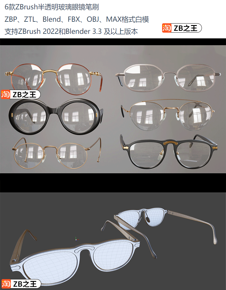 ZBrush复古眼镜IMM笔刷ZTL模型OBJ老花镜眼镜雕刻ZB笔刷3D素材
