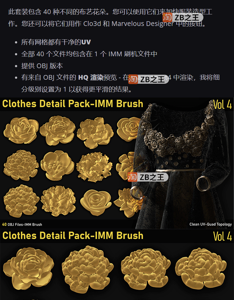 ZBrush素材40款服装衣服细节装饰布艺花朵ZBP笔刷带OBJ格式3D模型