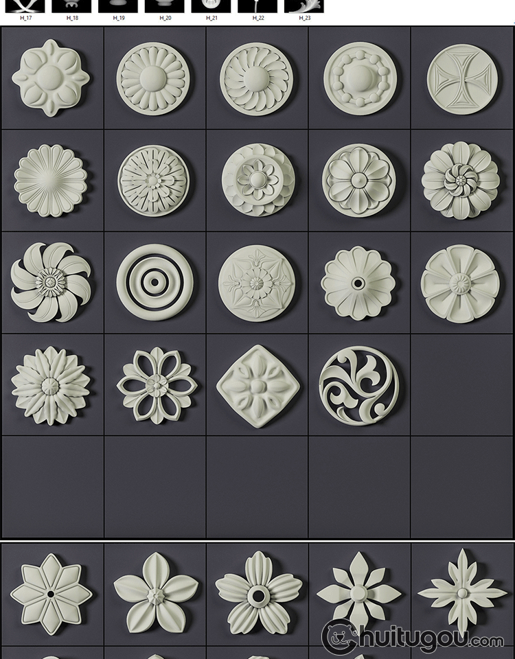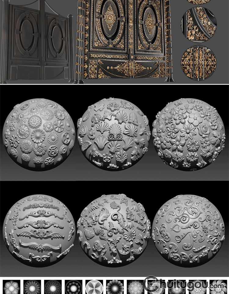 ZBrush古典装饰花纹雕花笔刷zb欧式腰线花纹图腾OBJ模型Alpha纹理