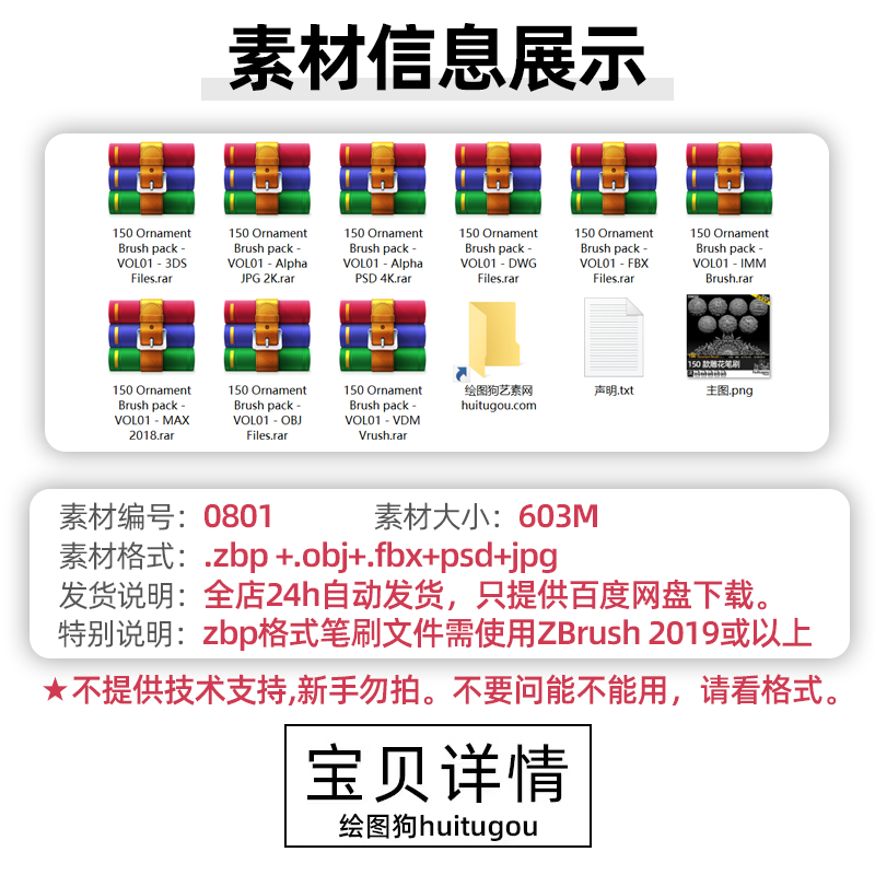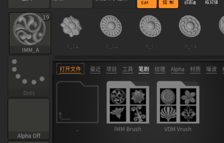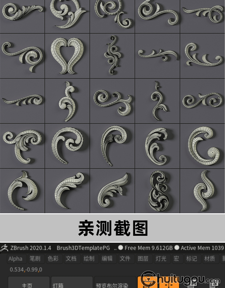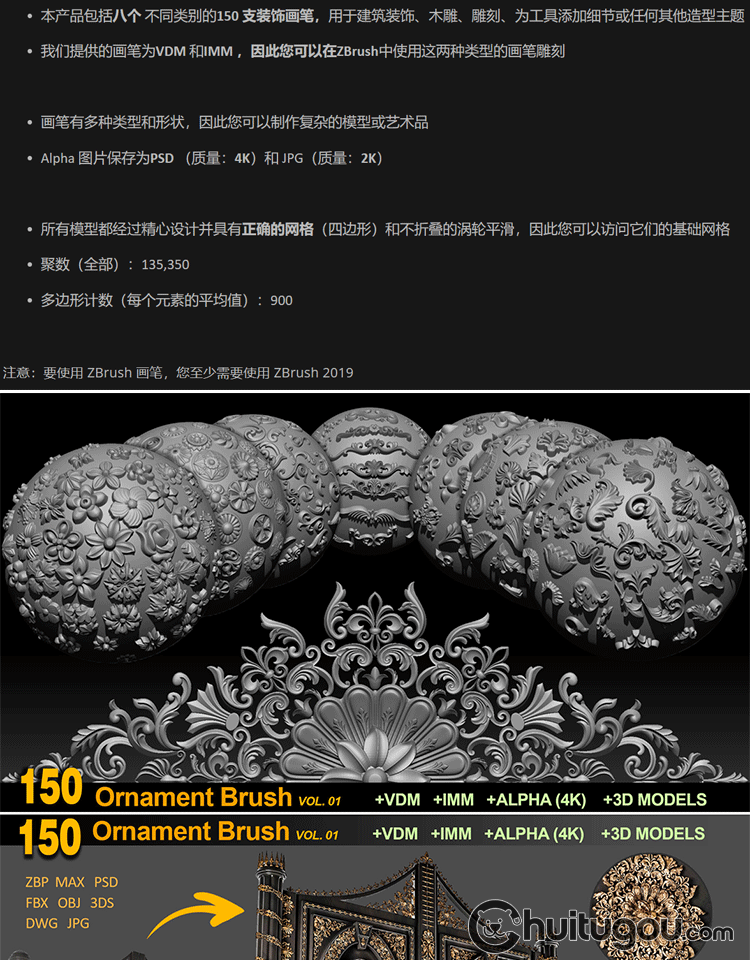 Zbrush雕花浮雕画笔笔刷zbp欧式装饰dwg花纹Alpha贴图fbx雕刻建模