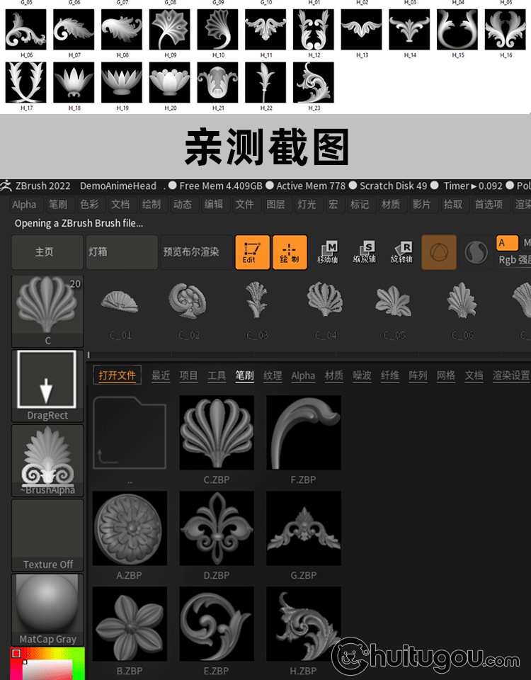 ZBrush笔刷55款装饰雕花花纹zbp笔刷ABR格式alpha纹理贴图ZB素材