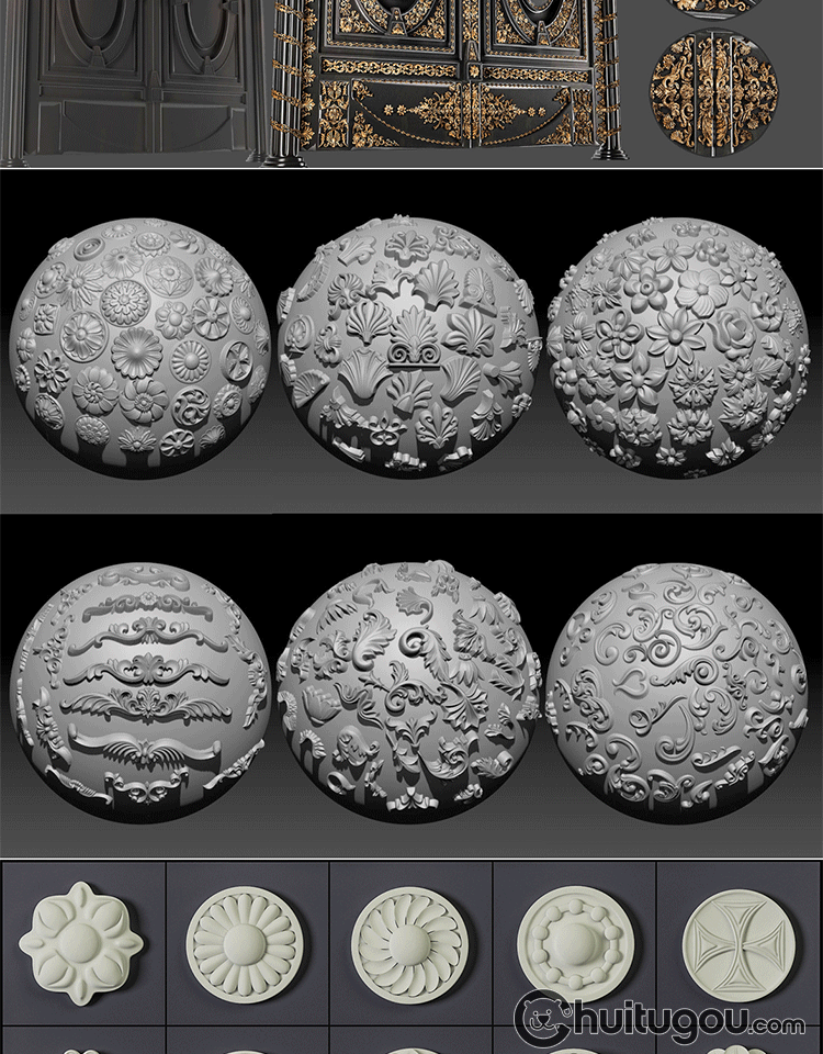 Zbrush欧式雕花装饰花纹IMM笔刷ZB画笔alpha纹理贴图 OBJ模型C4D