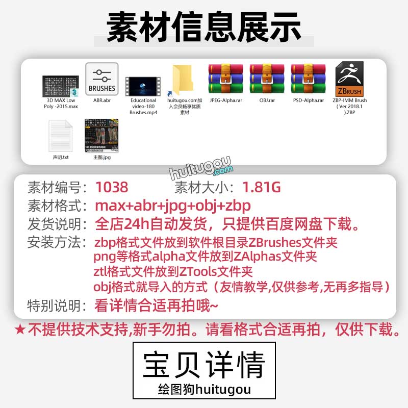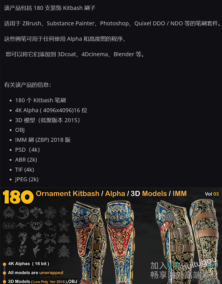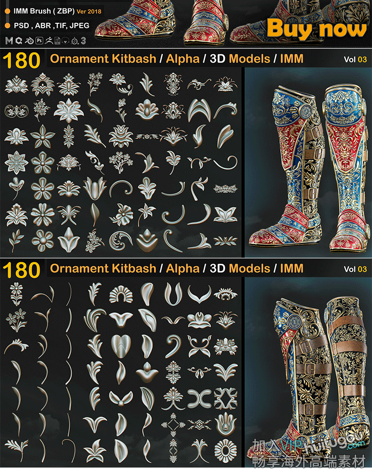 ZBrush笔刷66款复古花纹装饰雕花IMM笔刷ZB雕刻OBJ模型Alpha纹理