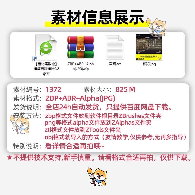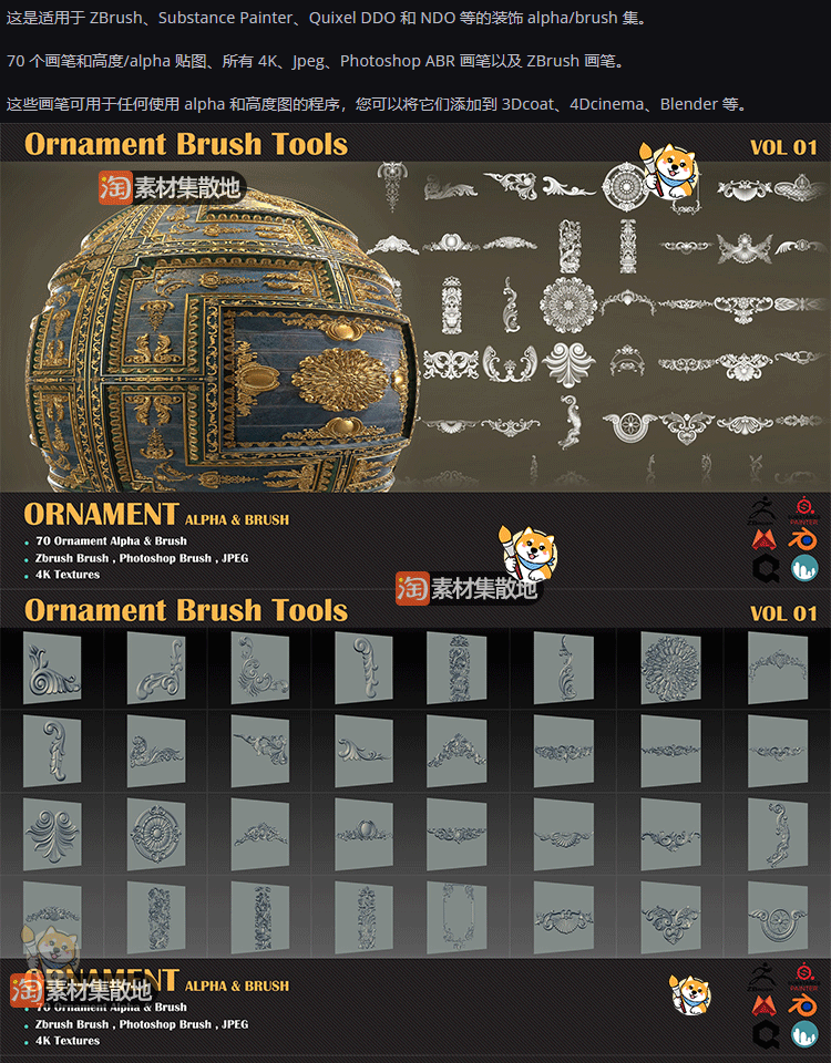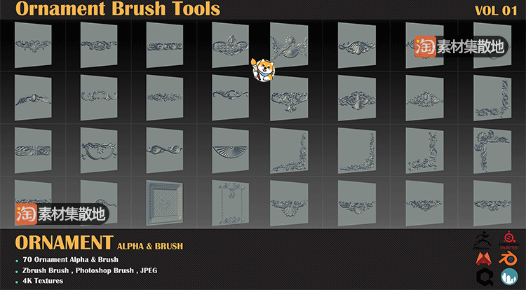 ZBrush笔刷70款装饰花纹图案ZBP笔刷带ABR格式JPG格式alpha纹理