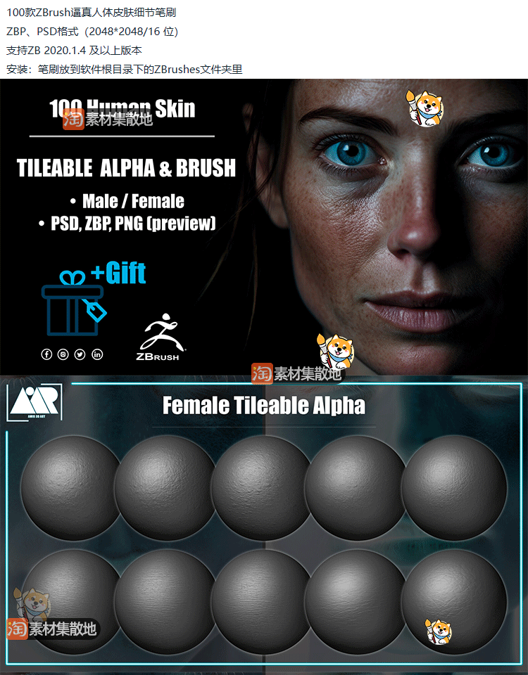 ZBrush笔刷100款逼真人体皮肤细节ZBP笔刷alpha纹理图ZB雕刻素材