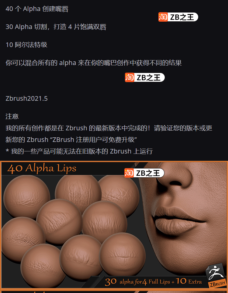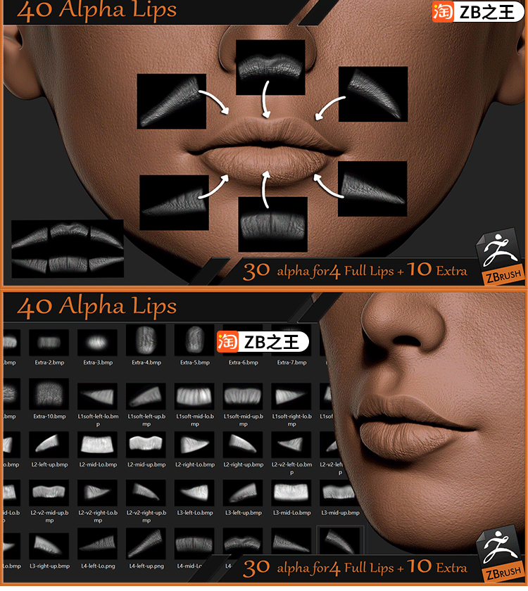 ZBrush素材40款唇印嘴唇alpha笔刷png格式置换贴图纹理ZB雕刻人物